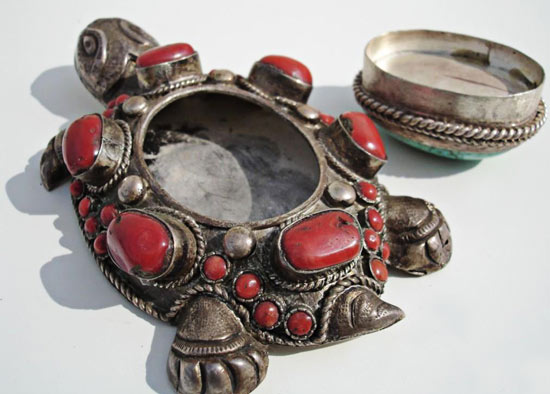 Nepal -- very intricate and interesting turtle shaped box (the large turquoise stone is attached to the removable lid) that is decorated with coral and turquoise. This item is 3 3/4" long.