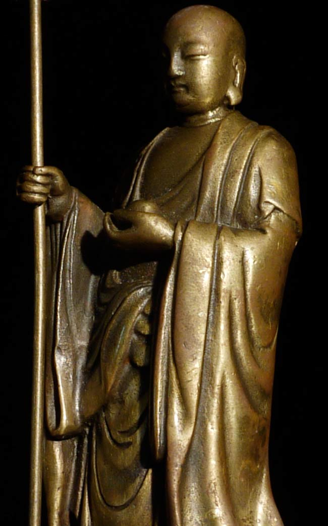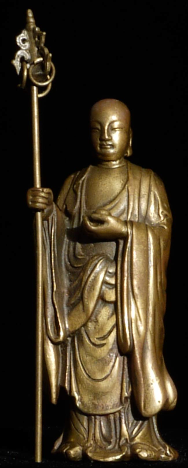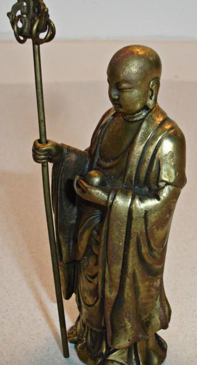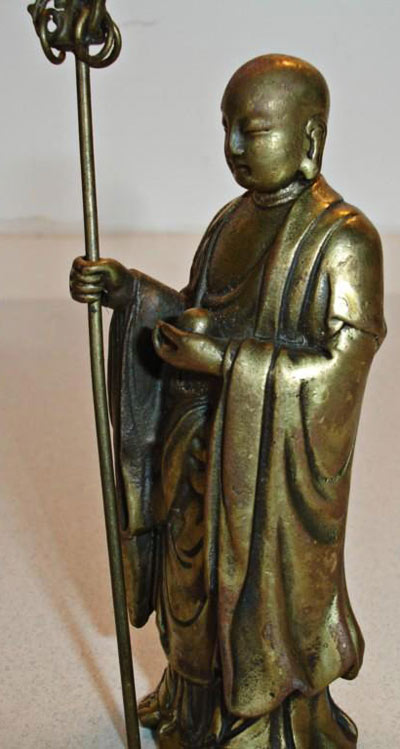 This listing is for a very nice, intricately detailed and heavy antique solid brass standing monk in flowing robes holding a scepter.