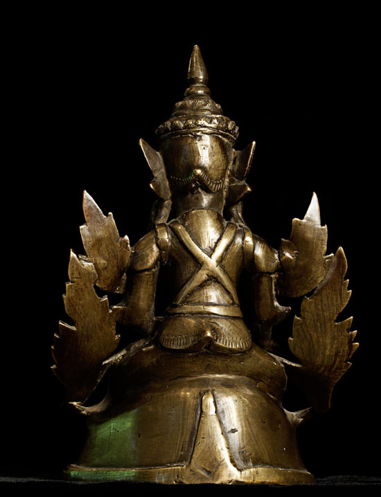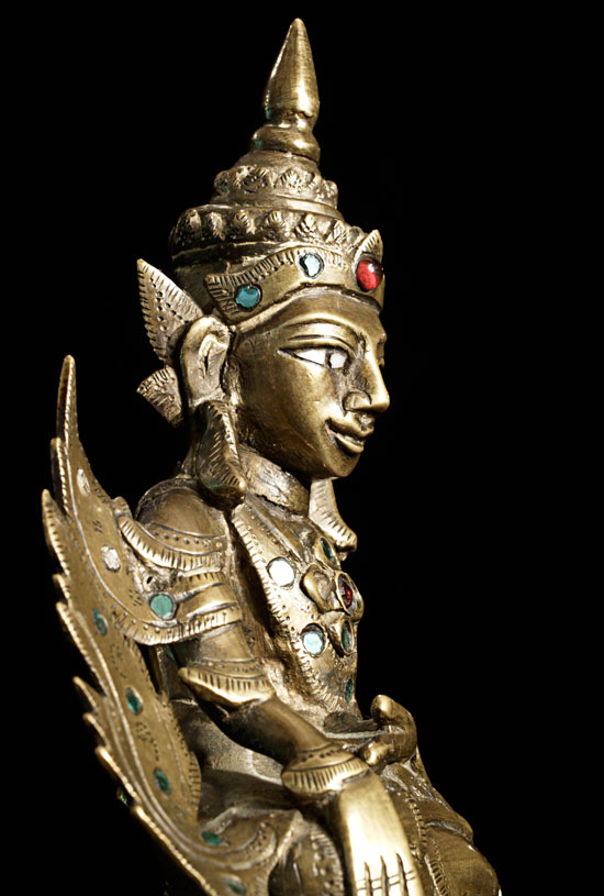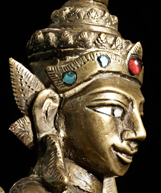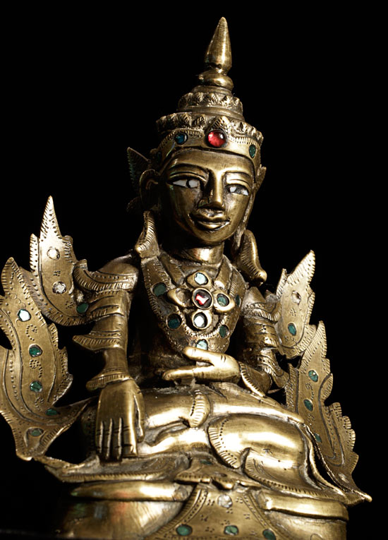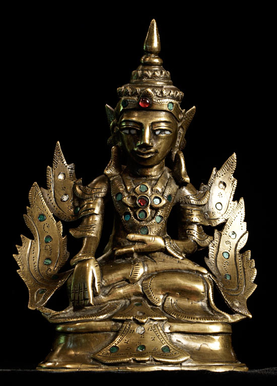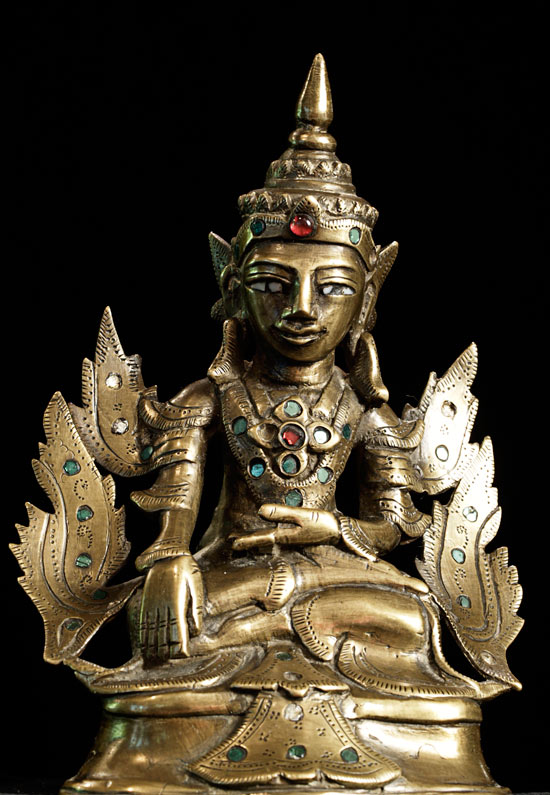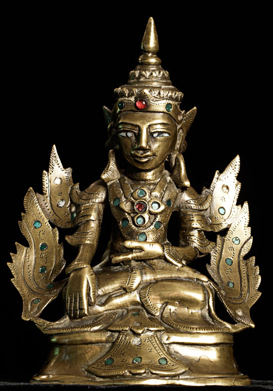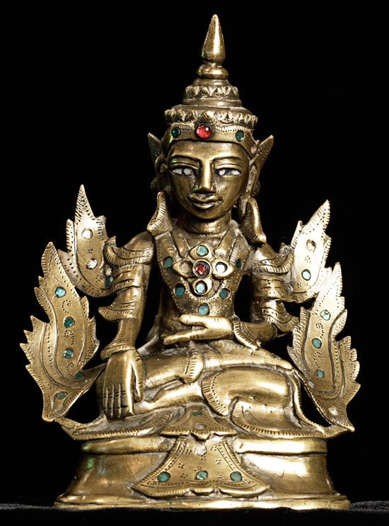 Burmese Buddha in Royal Attire-- a little under 6 inches (152mm) tall and is 4 inches (102mm) at the widest and 2 3/4 inches (70mm) deep. He is inset with many small pieces of foil backed green glass, there is a red cabochon to his head and the center of his breast, his eyes are inset.