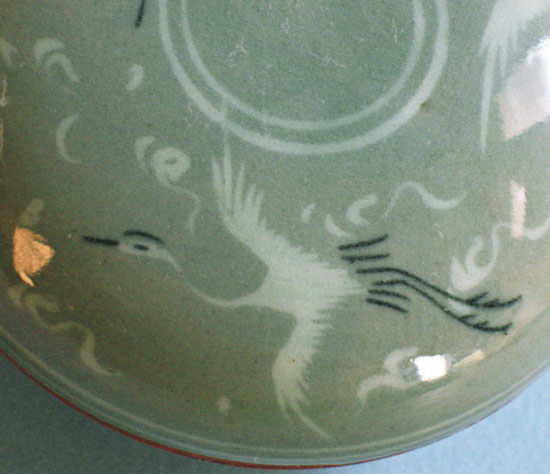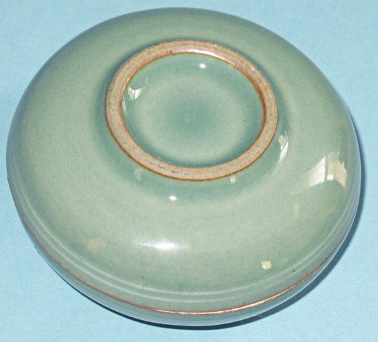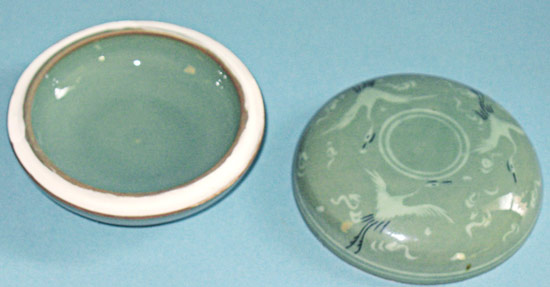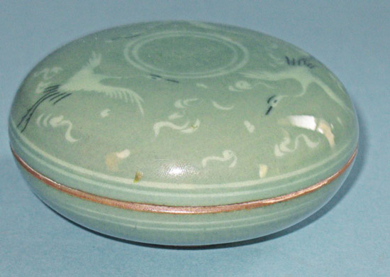Beautiful Korean round piece in celadon, with Cranes adorning the cover. It measures 4" in diameter, and about 2" high. Excellont condition. Skillfully executed. Estate piece.