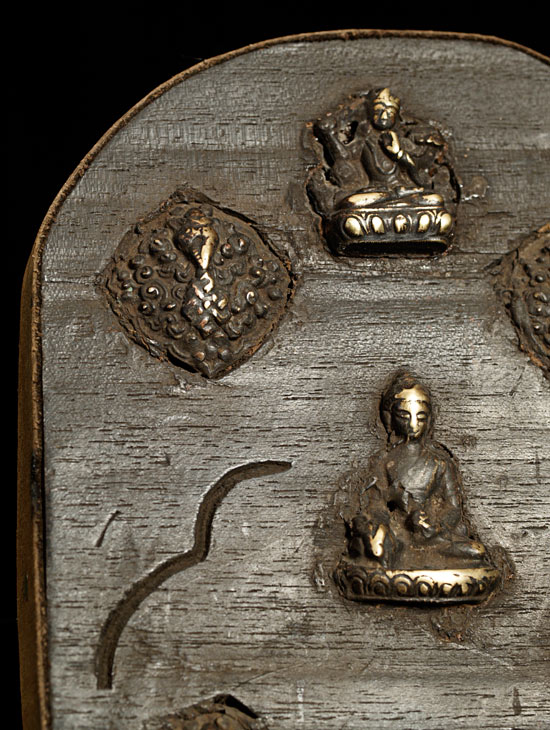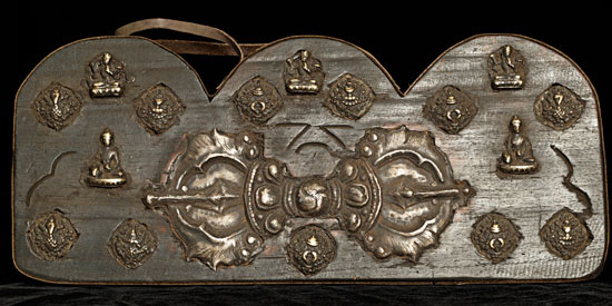 Unusual vintage/old piece. The large dorge is made of iron and the Buddhas a nd Bodhisattvas are bronze. 18" long, 8" tall, 1" thick
