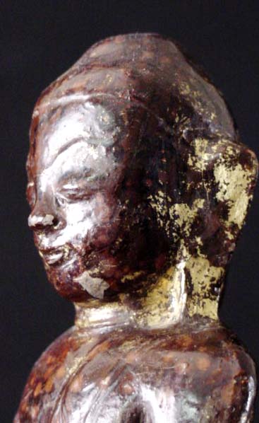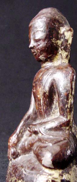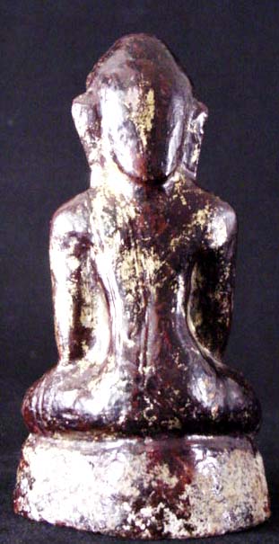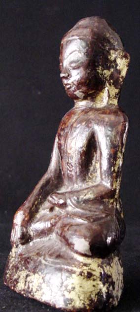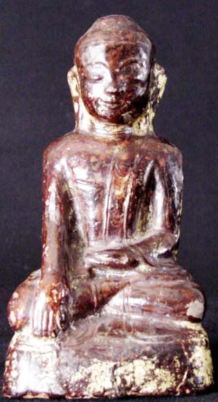 This is an extremely uncommon Buddha from Burma . It is in a late Ava style, and is made of a glazed terracotta or clay. I have never seen a piece like this before. Virtually all of the Burmese terracotta Buddhas are smaller or are votive plaques, and none that I have seen have been glazed. In exceptional condition, with no damage or repairs. It was originally gilded, and some of the gilding remains. The brownish red glazing has some expectable wear and minor loss, but is overall in good shape. Stands 6 and 1/4 inches high. A one of a kind.