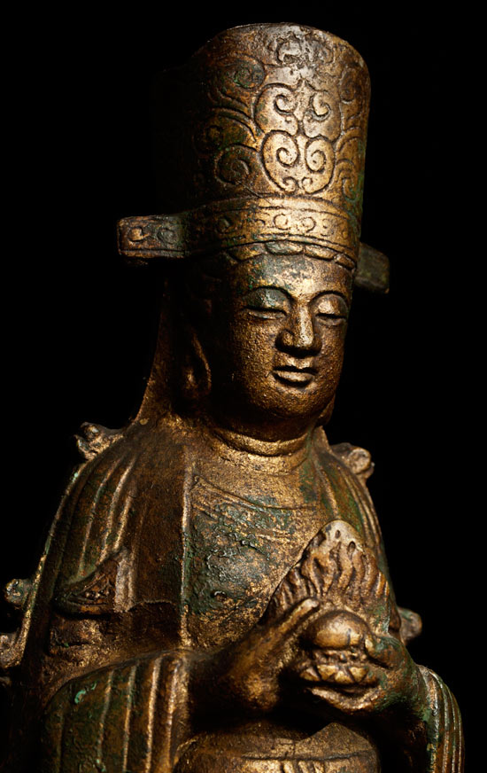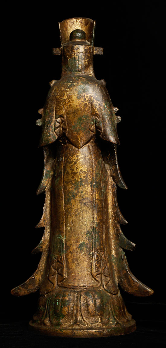 Symmetrical flowing robes,with serene face. Retains traces of gilding.