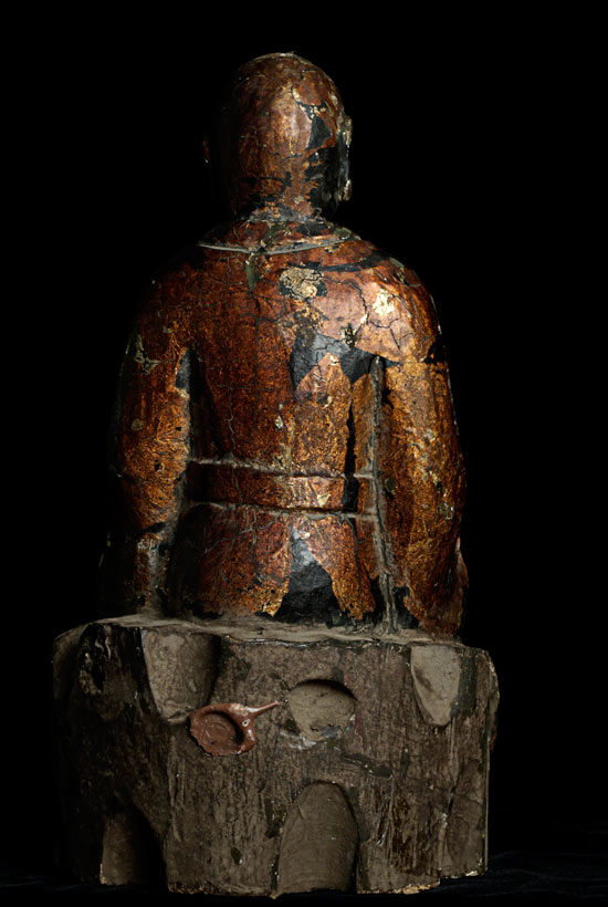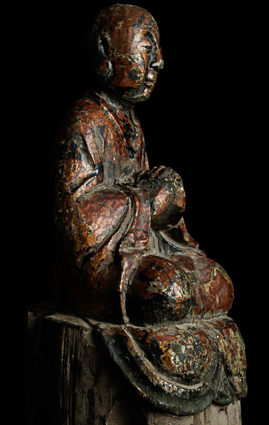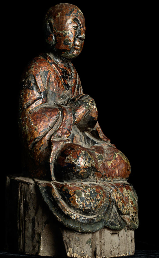 Wooden seated Buddha sits approximately 13" high. Base is approximately 6" x 7"