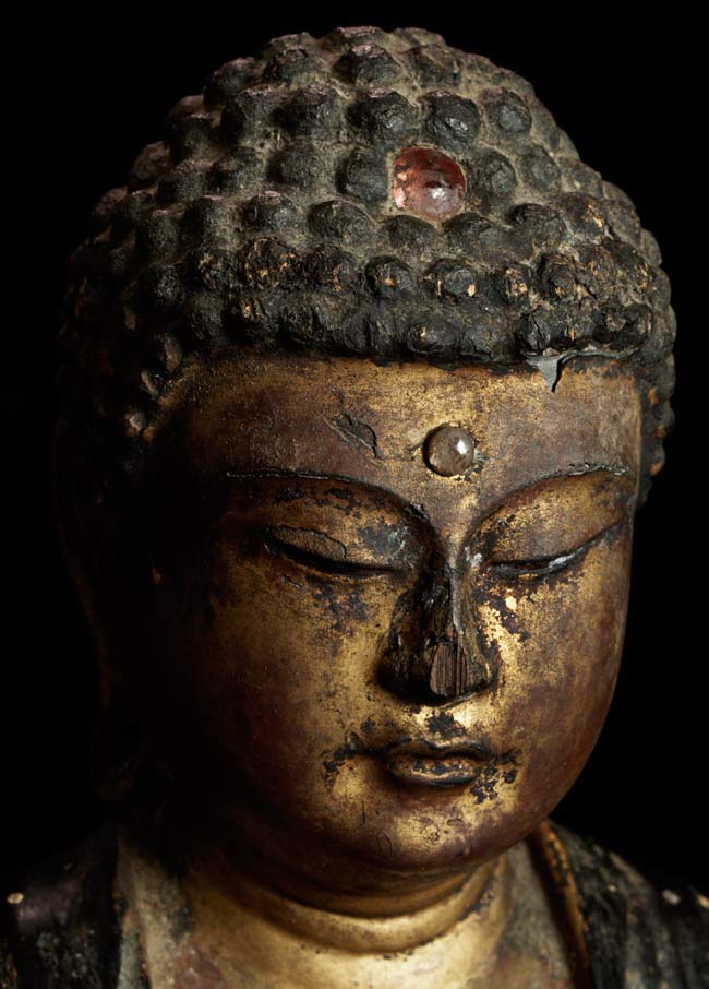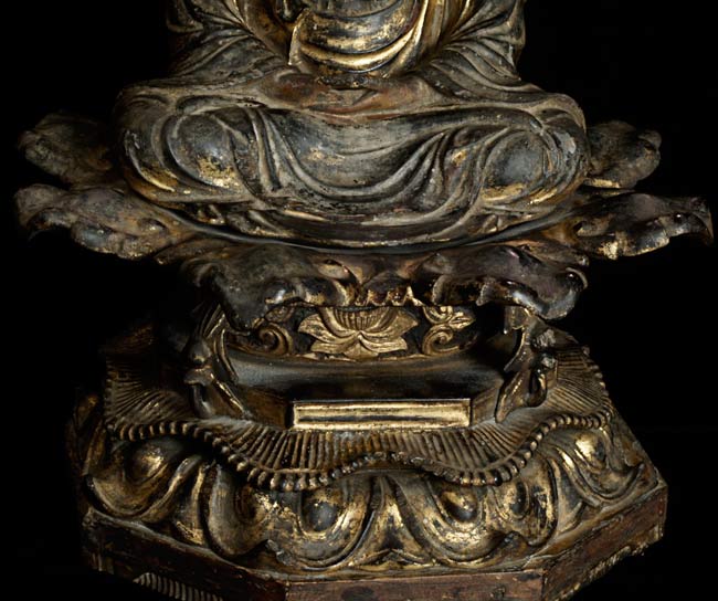 Gorgeous 500 year old Japanese buddha seated on a lovely lotus blossom. Probably Muromachi. Some loss and repair. Very special base.