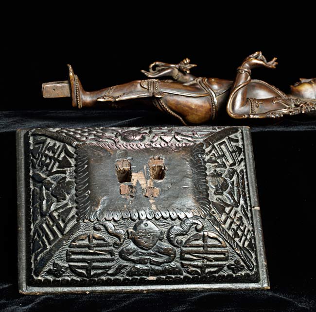 Copper 11.5" inches tall, an ornate wooden base that measures 7" x 5.5" by 1.75" tall