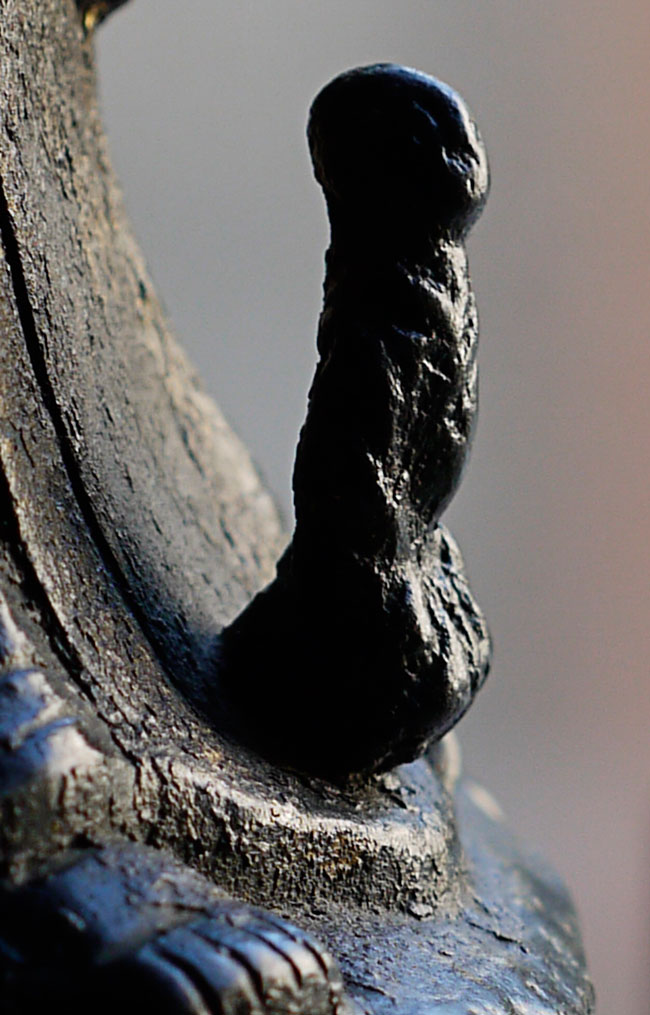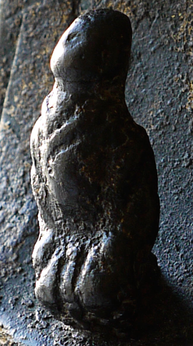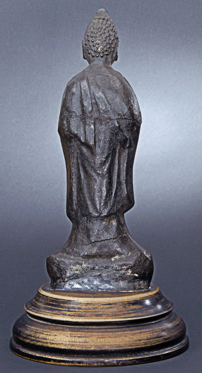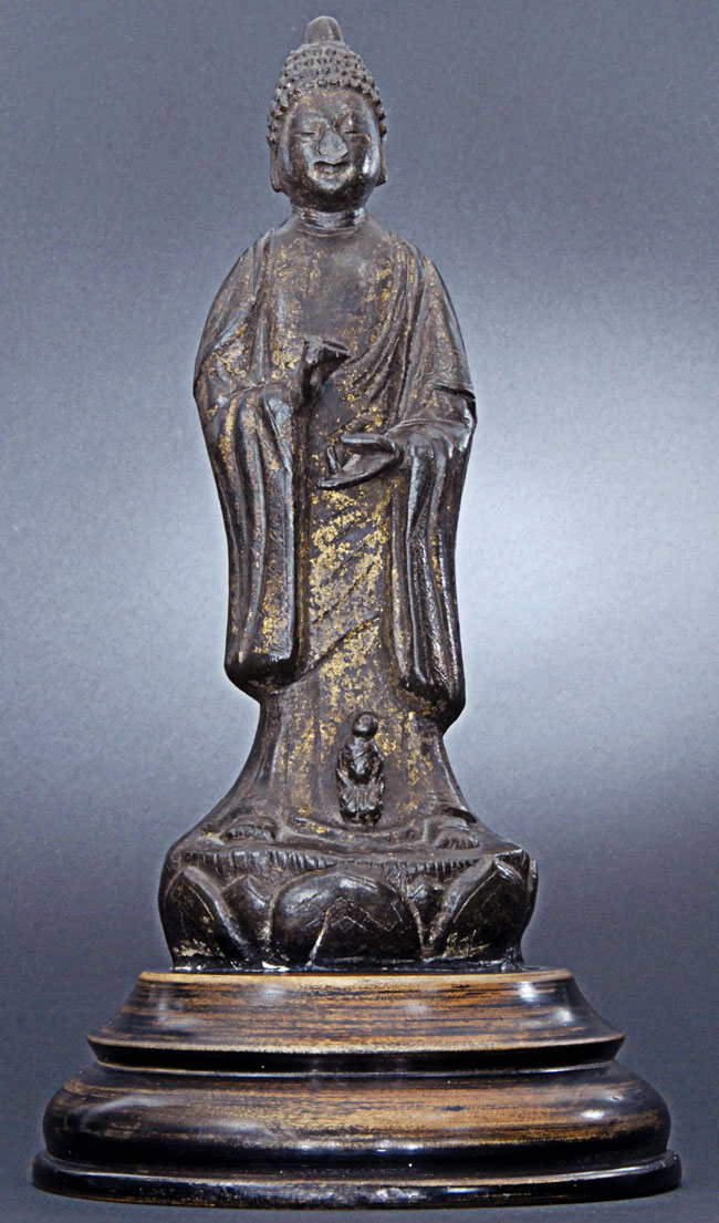 Looks to be from the Liao Dynasty, plus or minus 100 years. Quite rare to find in this size-also, note the unique figure on his robe just above the base. Even though his nose is flattened, his wonderful face radiates joy and serenity. Very special.