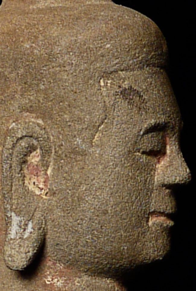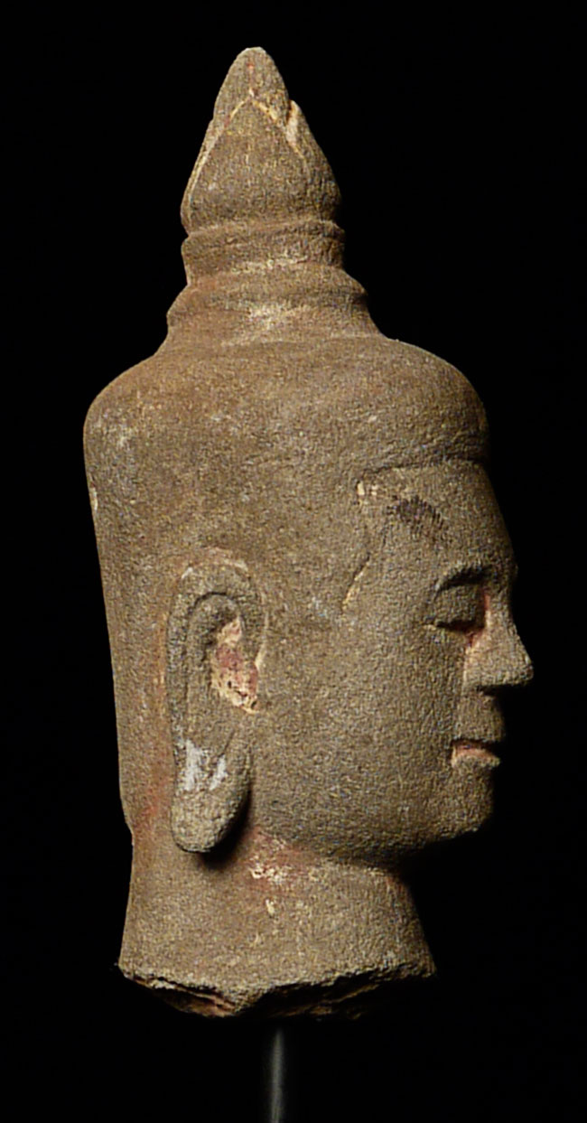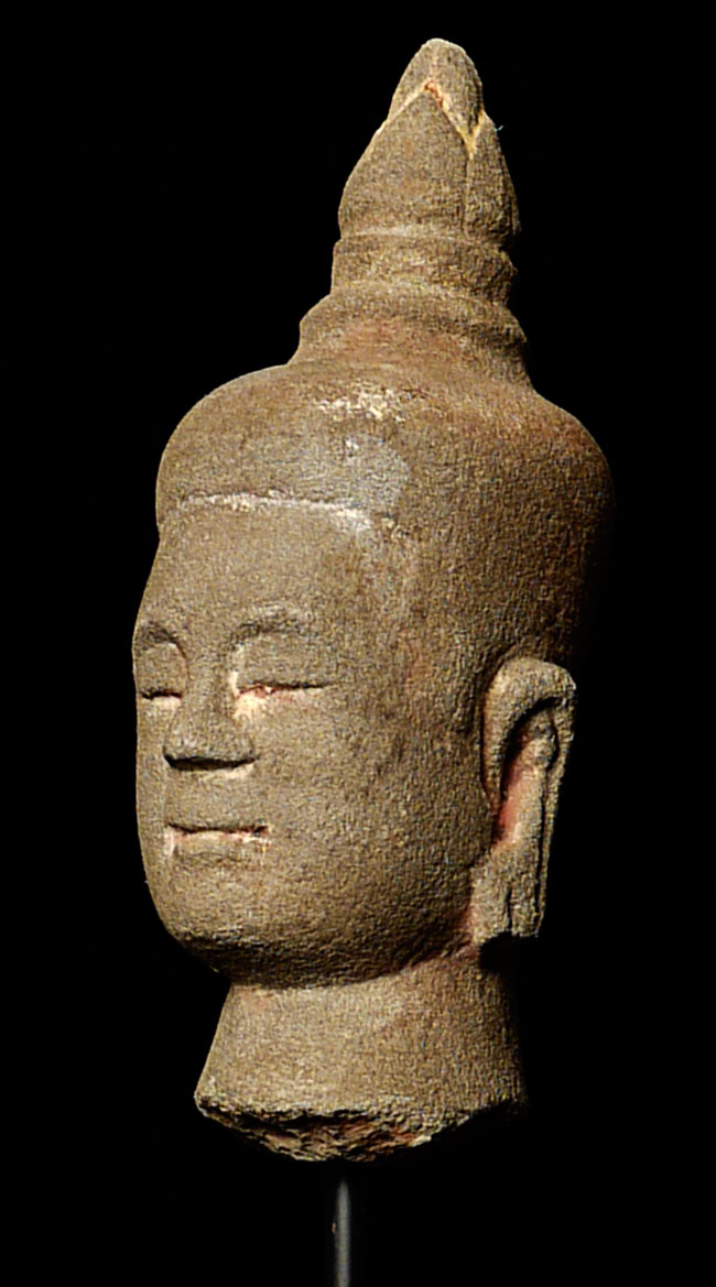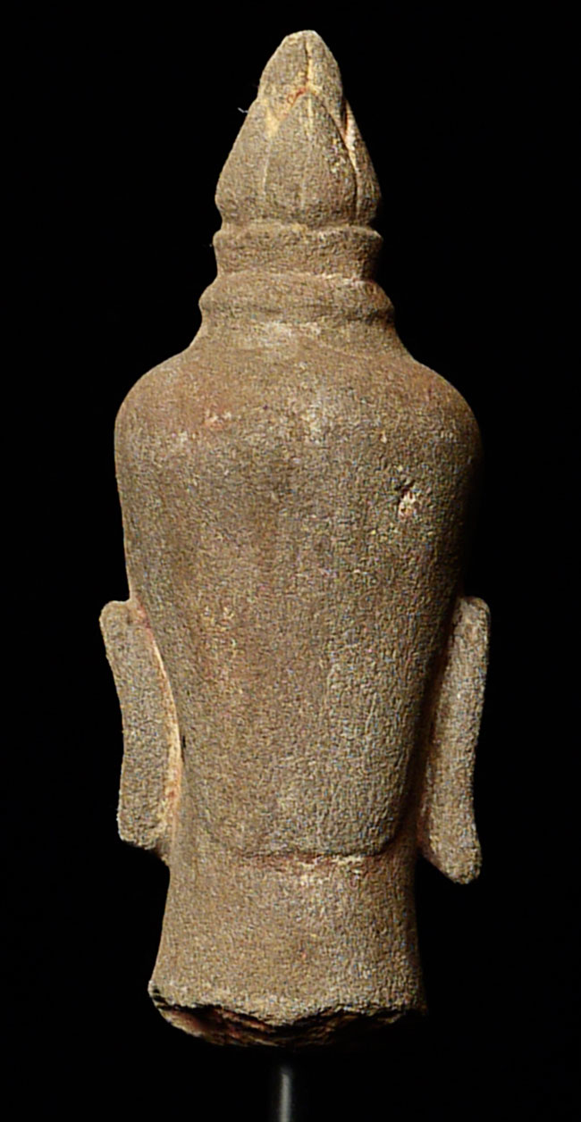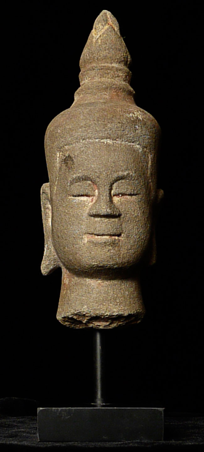 18th Century Thai Stone Buddha head is 8.25" tall, including the base, which is 2 1/8" tall to the bottom of the head.