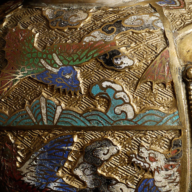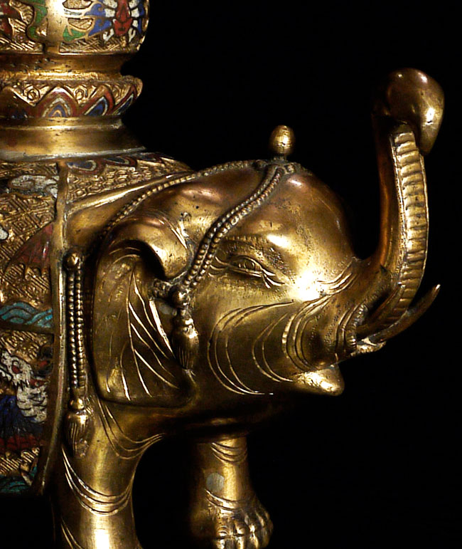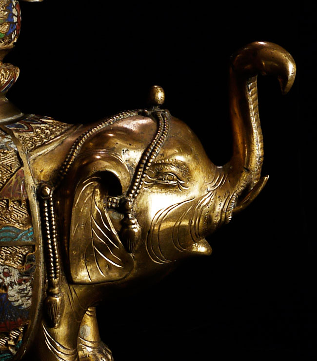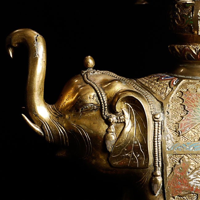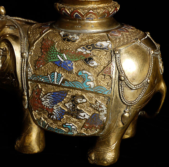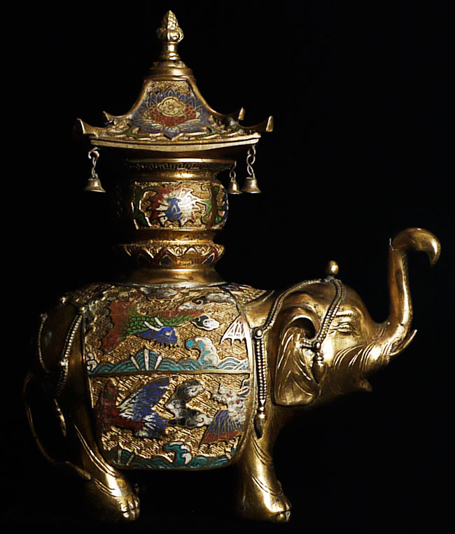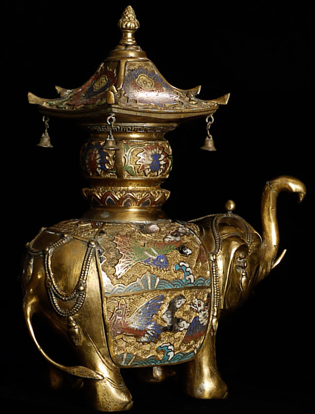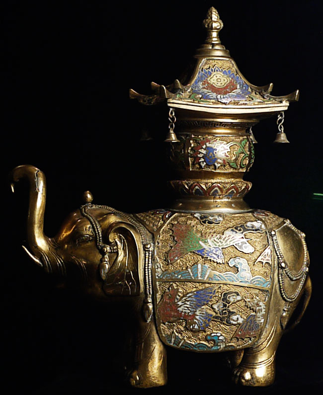 Exquisite late Meiji bronze and cloisonne elephant. To the tip of the pagoda on the elephant's back measures approximately 16.5". Length is approximately 13", toe to tip of trunk. From side to side, he is 5" wide. Collected circa 1910-1920