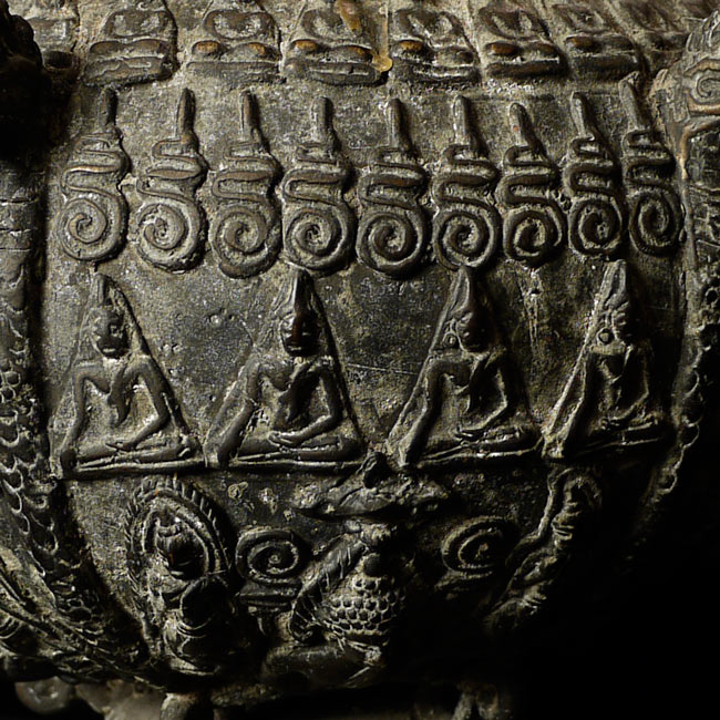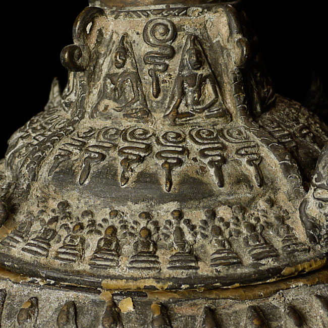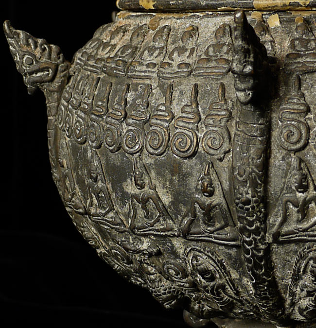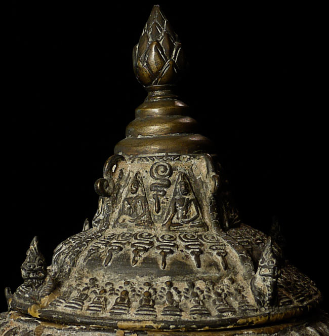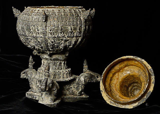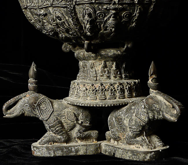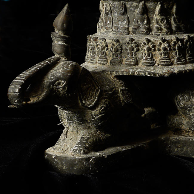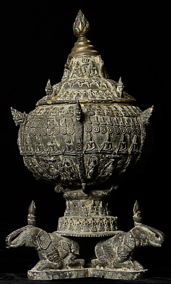 Authentic Thai Rattanokosin Era Buuddhist Reliquary. Incredibly detailed, with well over 100 Buddhas on the surface. Supported by 3 elephants. Extremely large at 16.5" tall, and has an approximate diameter at the base of 8.5". Remains of wax lining the interior. there are many examles of this type made to sell to tourists- extremely few period pieces.
