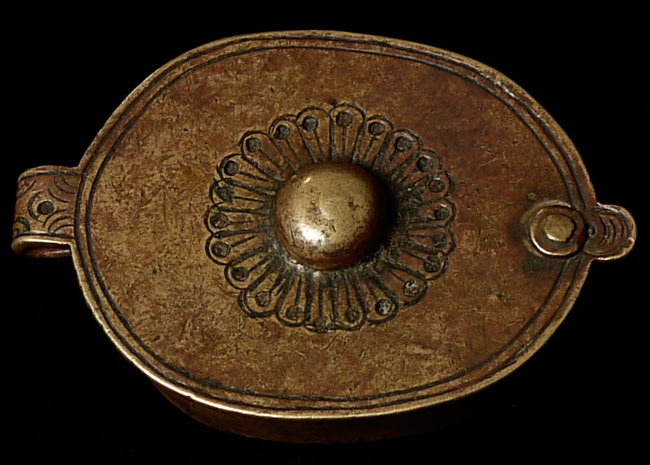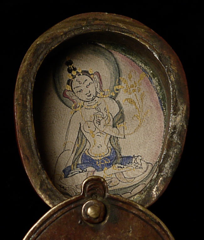Unique Tibetan Pocket Shrine with miniature Thangka. Measurements on this piece are approximately 2.5" x 1.75", and 1/2 inch tall.
