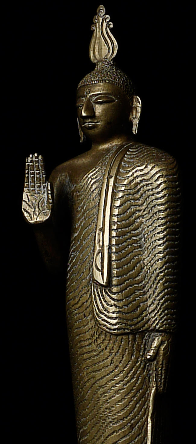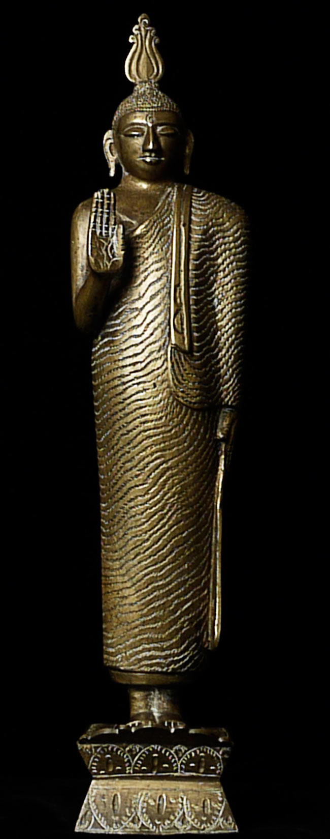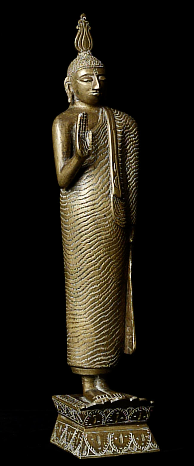 18thC Sri Lankan Buddha stands 12" tall, with a base measuring 2.5" x 2.25". Serene and intricate!Large, beautiful example.