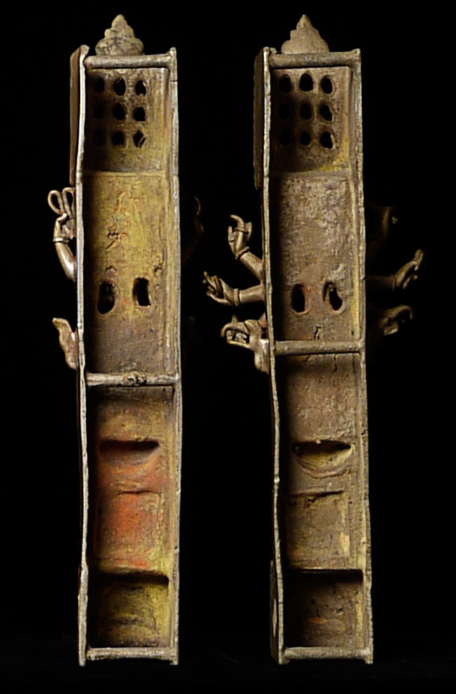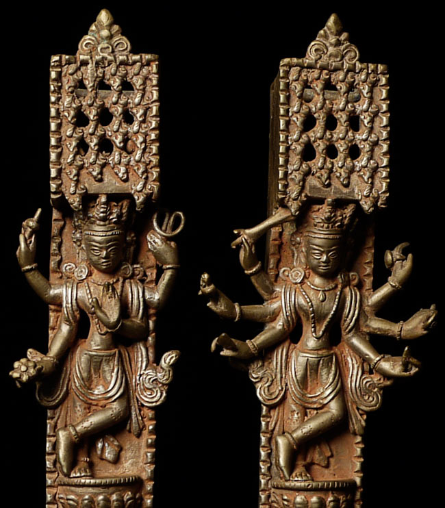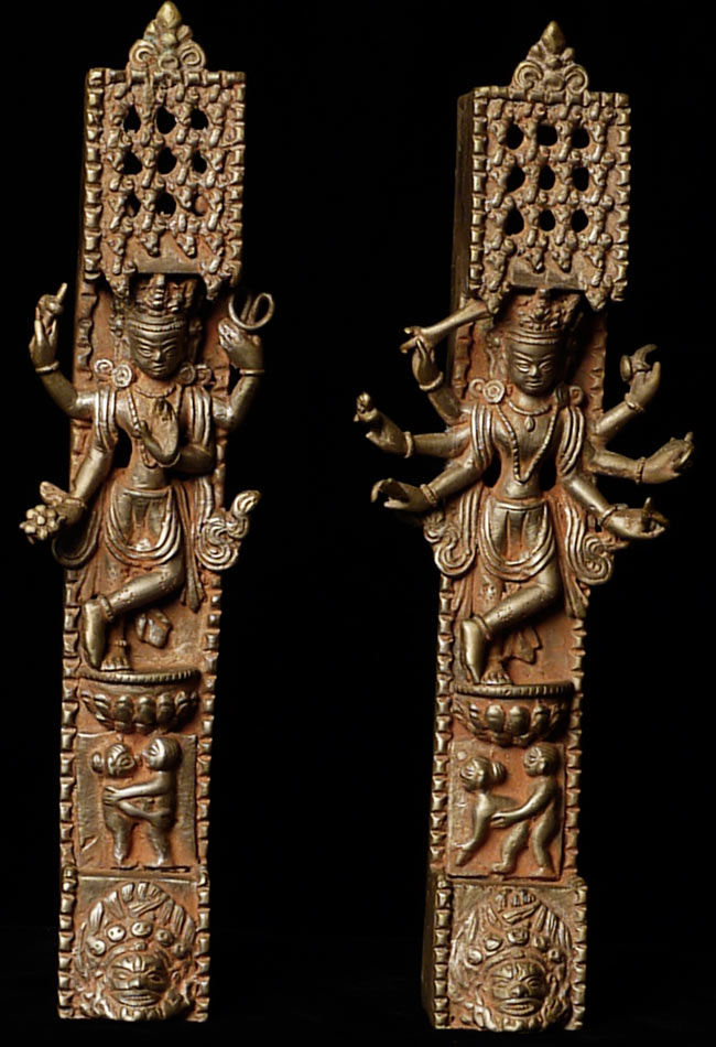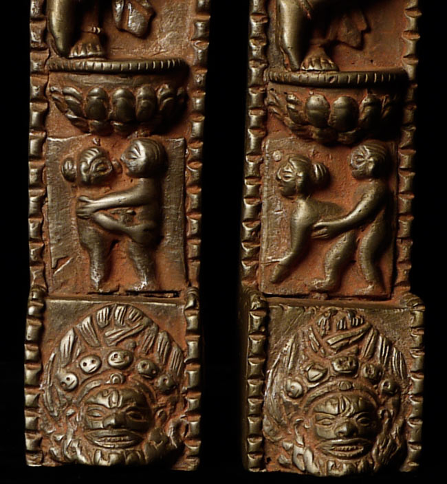 Pair of Tibetan bronzes Each has a different tantric deity in the middle. Below that is a couple in a different sexual position. Below that is a different fierce protective deity. 9" tall, 1.25" wide. Closely related to item 2161.