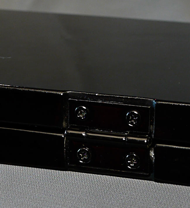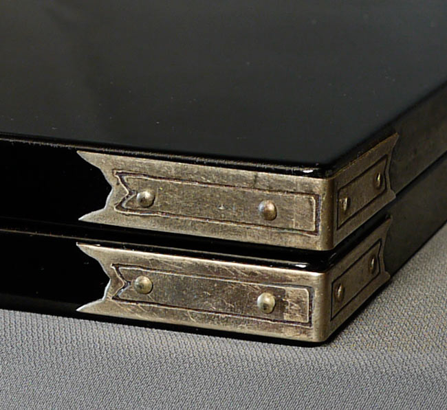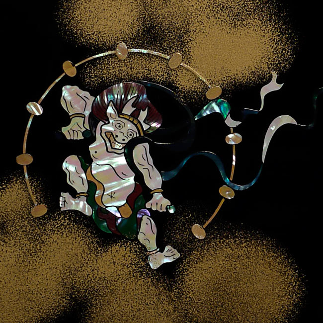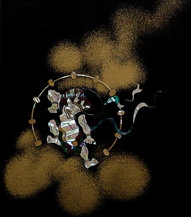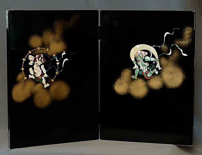 Japanese Vintage Lacquer Screen Mother of Pearl Inlay of Japanese Gods Fujin & Raijin. Estate piece. Gorgeous! - Open - ( 14.25"W x 9.875"H x .5"D ) Closed - ( 7"W x 9.875"H x 1"D )