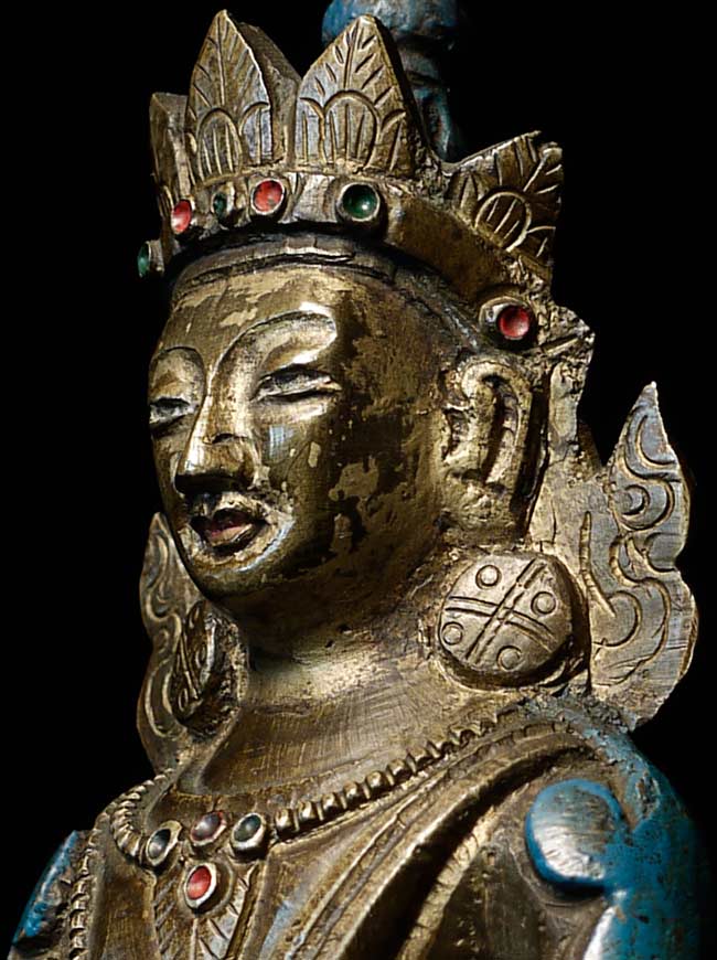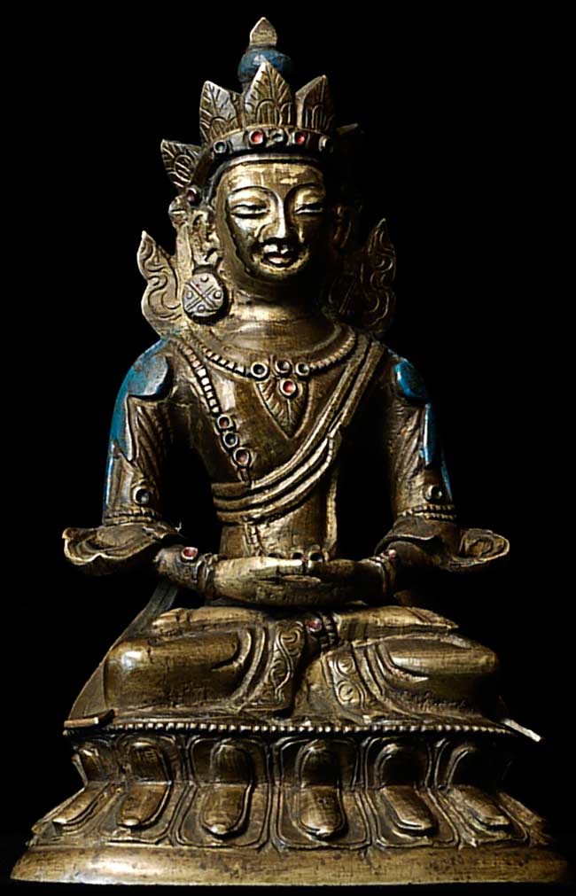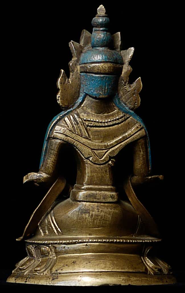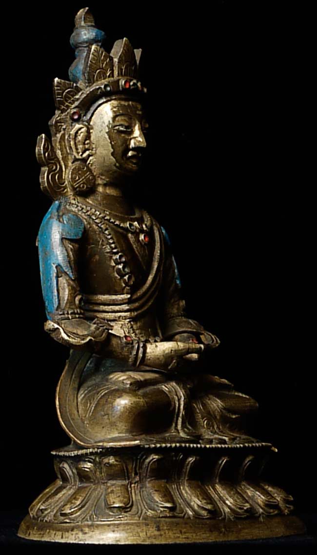 19thC Tibetan Amateyus-Bodhisattva of long life. Missing the bowl which would have been cradled in the hands (this is usually missing) 5 5/8" tall, base is approximately 3.5" x 2.75"