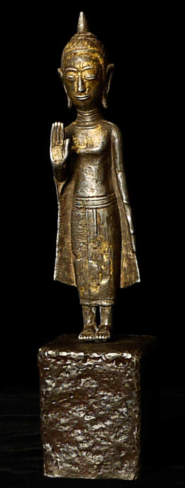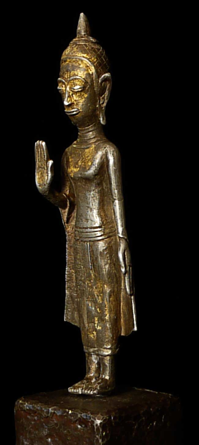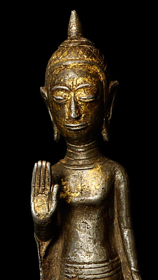 Fabulous Silver/Bronze standing Lao Buddha-huge happy head. Best of his type. All who look at him smile. 9 7/8" tall on a base that is 3" high, 2.25" x 2 5/8" Base was recently made by a metal sculptor.