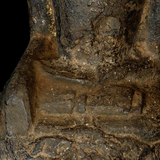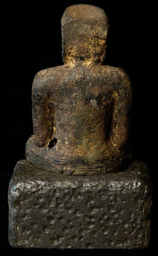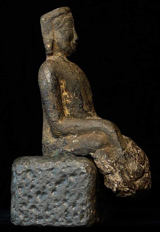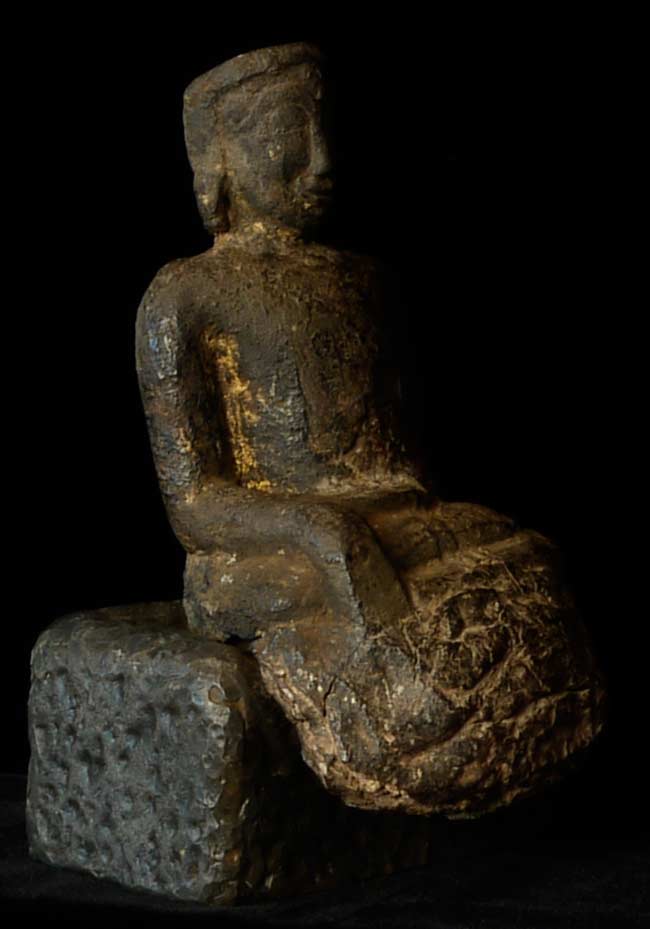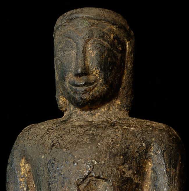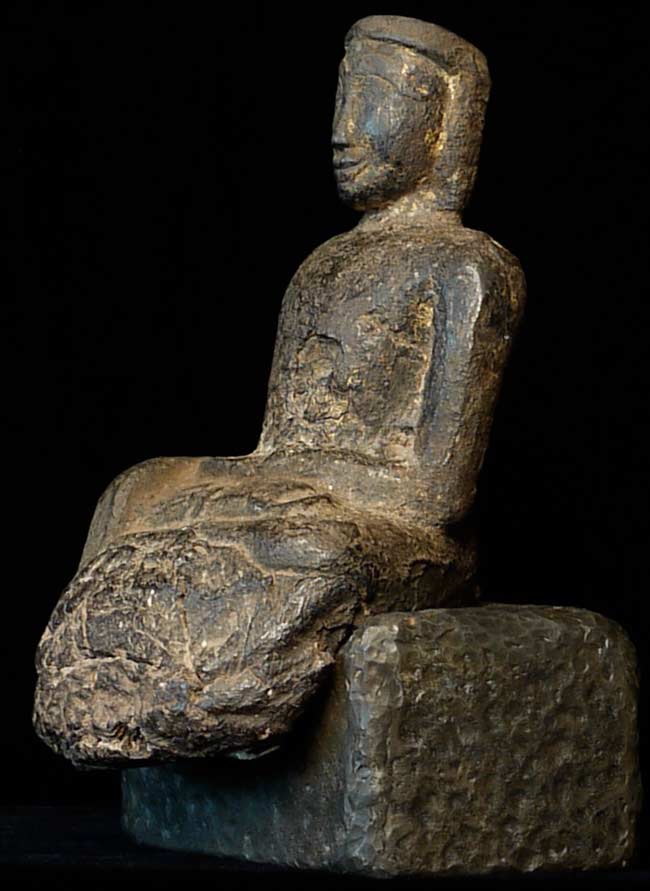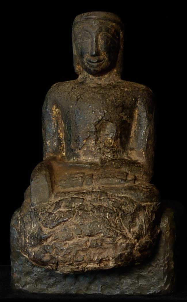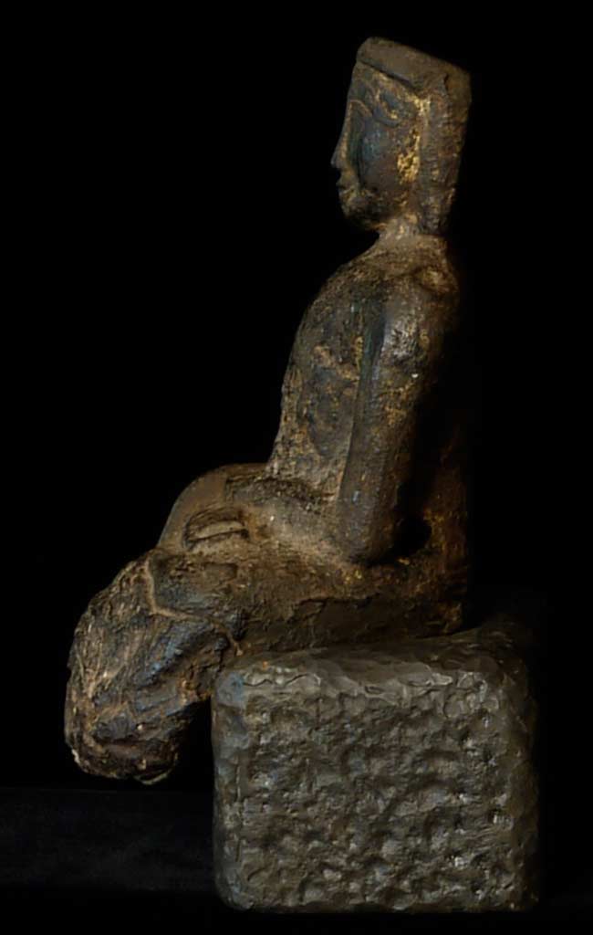 Earliest of Laos Buddhas. The first Buddha came in to Laos in the 13th century. This prototype was a standing figure-consequently they did not know what a seated Buddha looked like, This solid-cast ancient buddha sits on a custom metal base for a total height of 7.5". Quite rare.