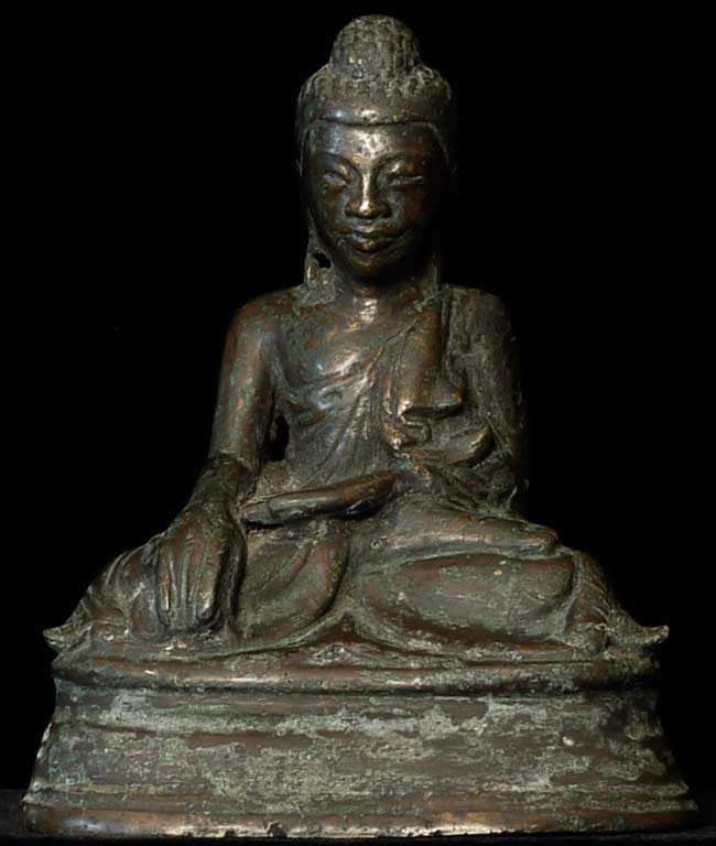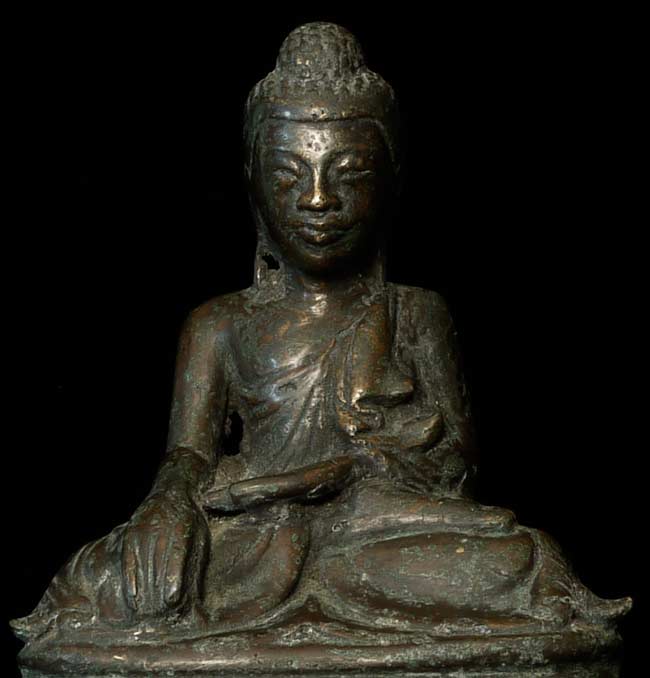 Thickly cast Mandalay style Buddha. Wonderful overall feel. Extremely heavy for its size. 6.75" tall, 5.25" x 3.75" on base.