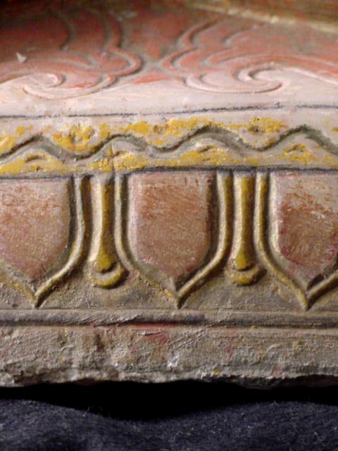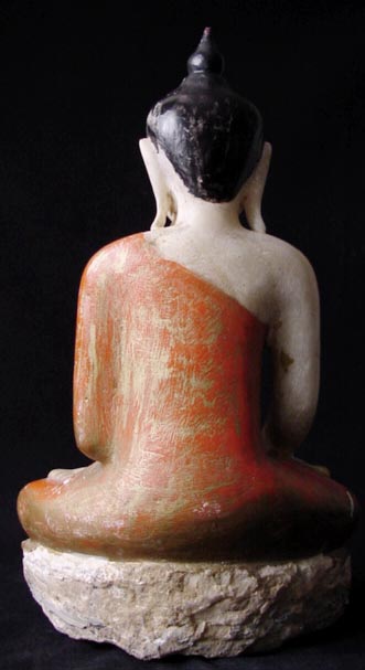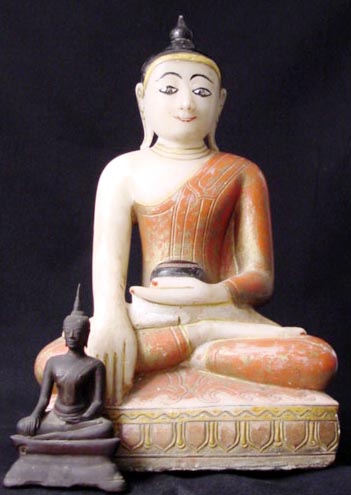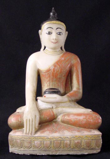 This is a delightful and quite substantial burmese marble or alabaster Buddha. It is a particularly nice example, with lively detailed sculpting and vivid polychrome. In excellent overall condition. It weighs over 43 pounds, and is 19 and a half inches high. It is a full 12 inches wide at the knows. I put a 7.5 inch Utong Buddha in one photo to give a perspective of it's large size. It stands on it's own, but has a tendency to tip backwards, so it could use a stand. I have it perfectly happy against a wall in my livingroom. This type of piece is getting very hard to find in this quality, condition, and size.