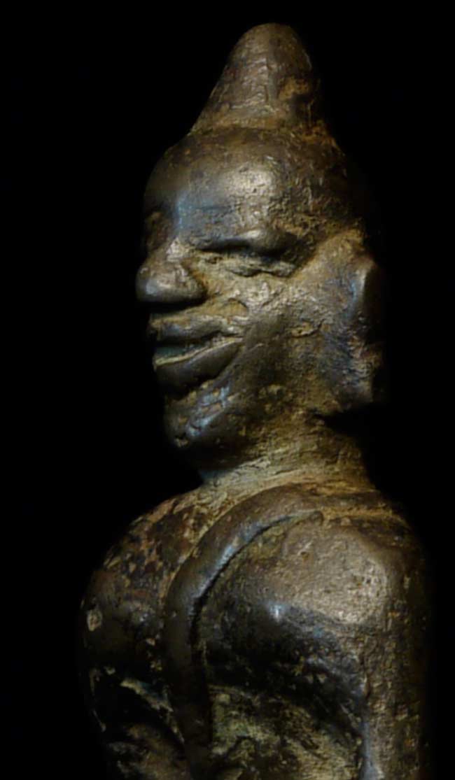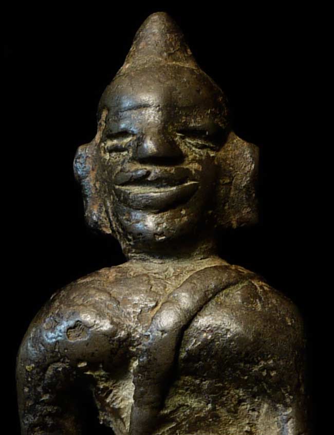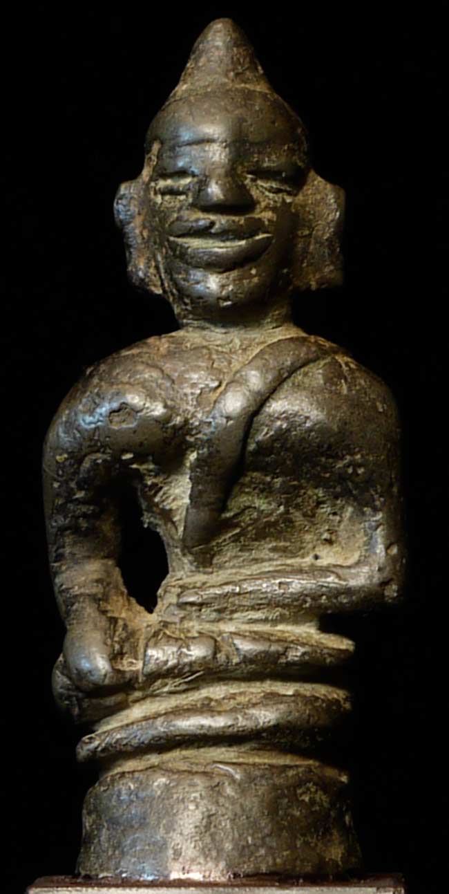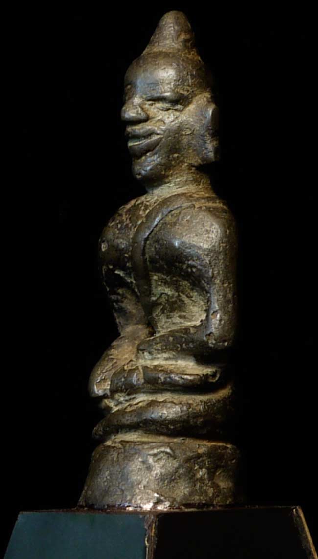 Wonderful solid cast folk Buddha. A long time favorite. You won't find another. 4 5/8" tall, 1 7/8" square on bottom of wooden base.