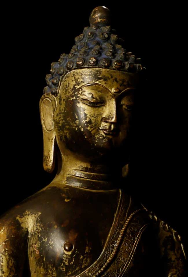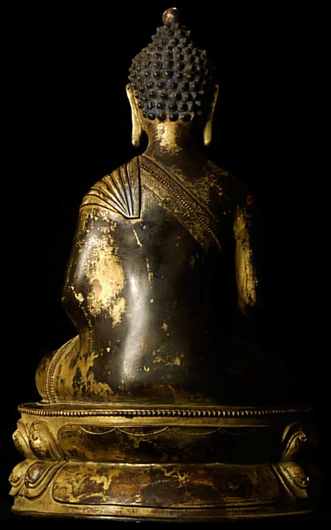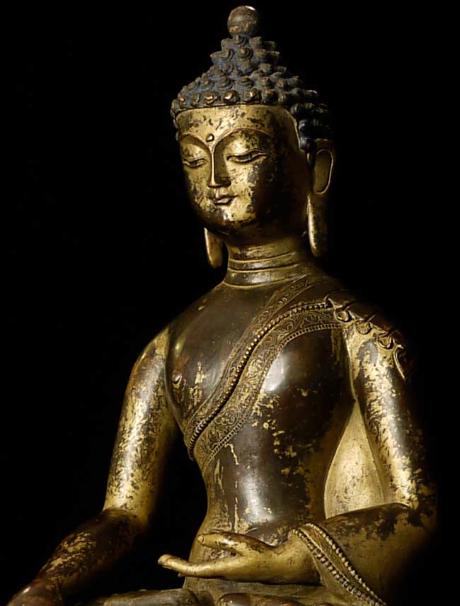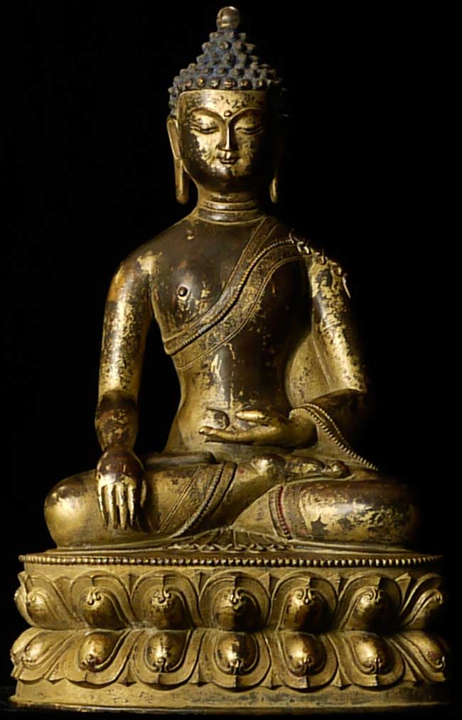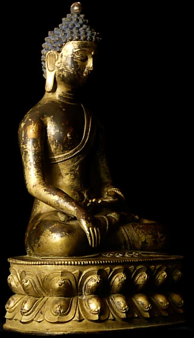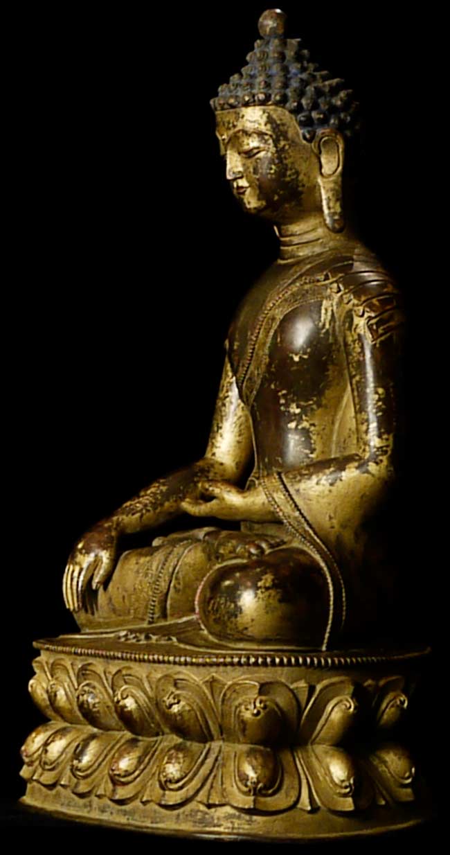 Beautiful thickly cast 14-16thC Tibetan bronze seated buddha on a lotus blossom. Superb sculpting, casting and finishing. He has a very distinctive look to him. A nice large size. A personal favorite.