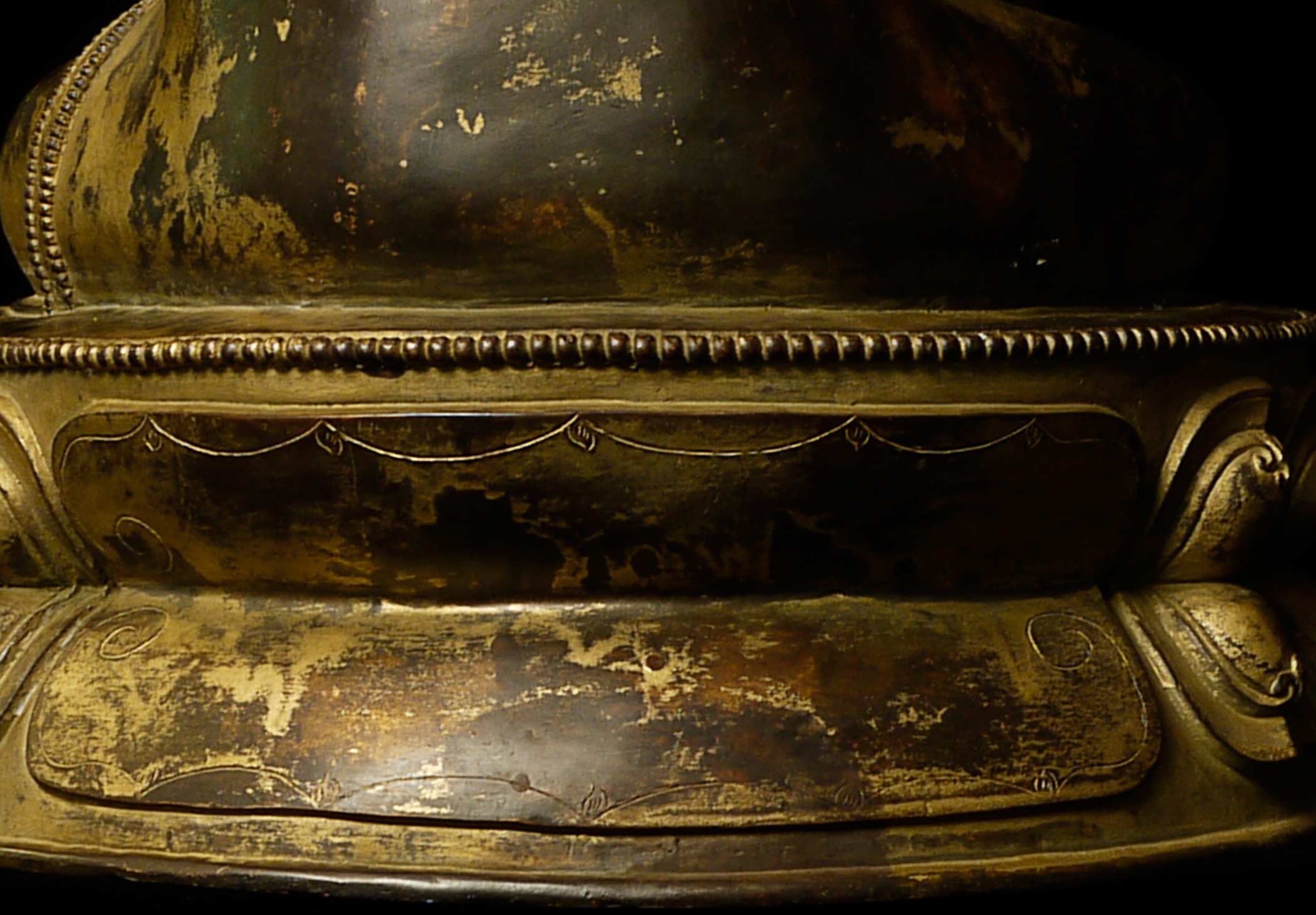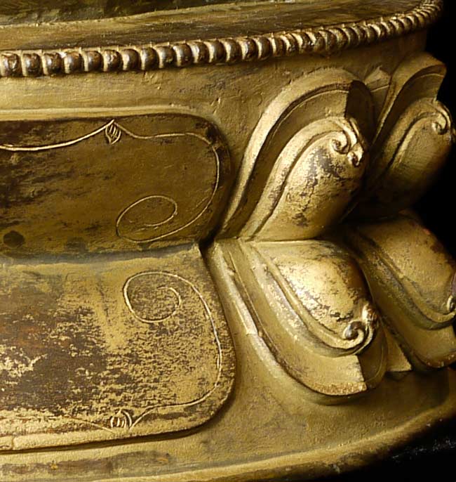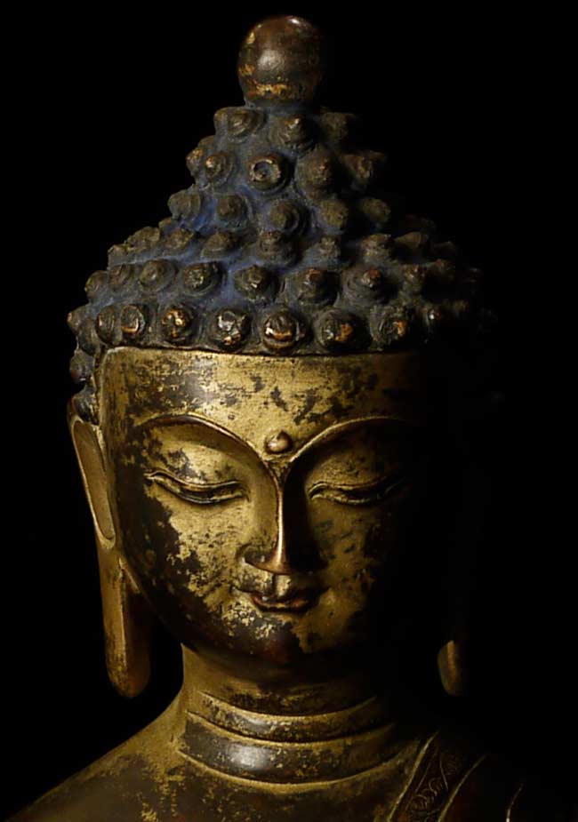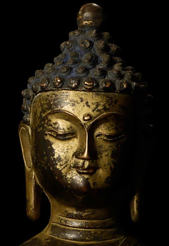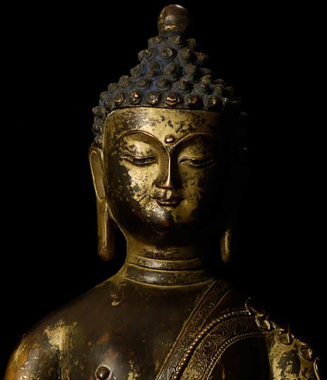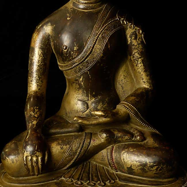 Beautiful thickly cast 14-16thC Tibetan bronze seated buddha on a lotus blossom. Superb sculpting, casting and finishing. He has a very distinctive look to him. A nice large size. A personal favorite.