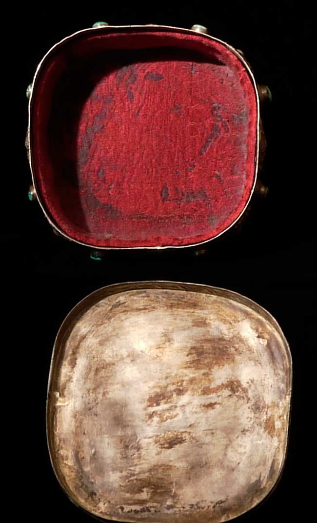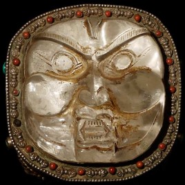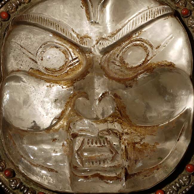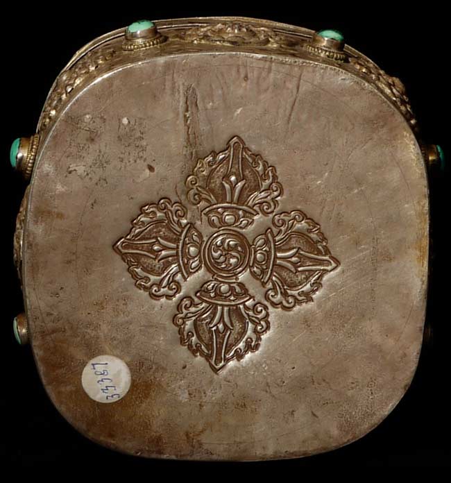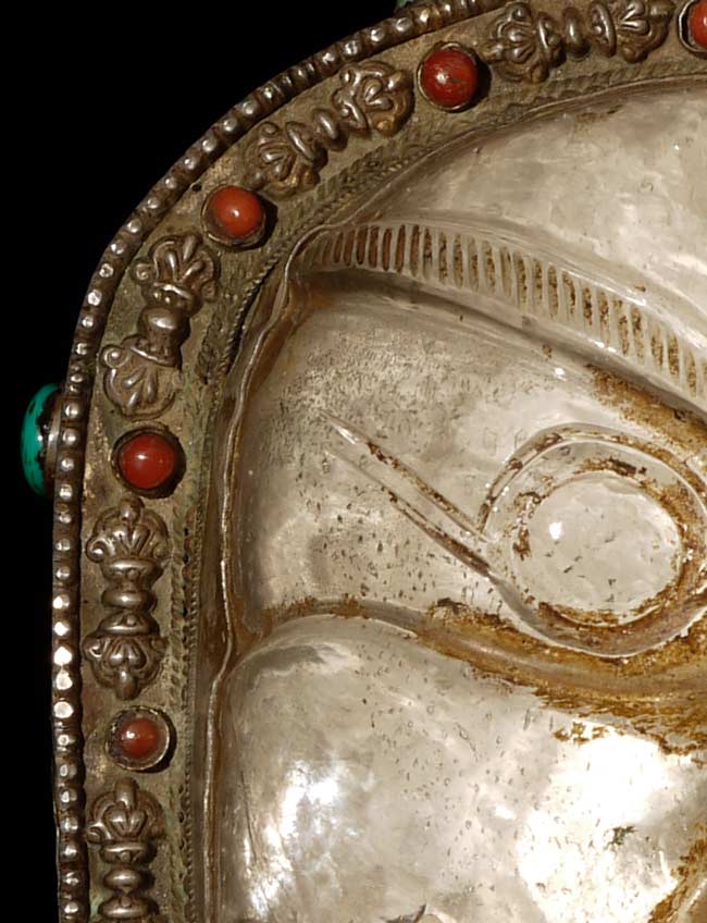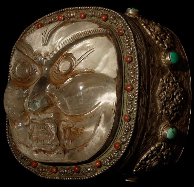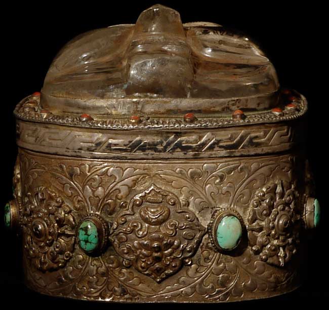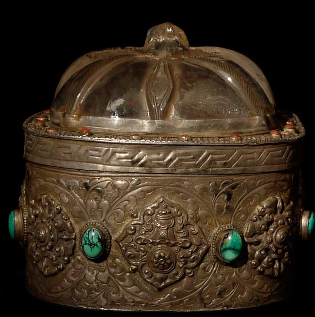 WOW- Fabulous antique Tibetan silver tantric box with fierce crystal face. Fine repousse work covers the box. There are turquoise and coral stones, and 8 silver repousse auspicious symbols (separate pieces) surround the middle. Interior has an old red silk(?)lining. Including face the box is 4.5" tall, and is 4.5" x 4 5/8". You are unlikely to ever see another!