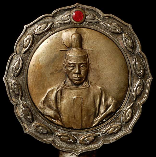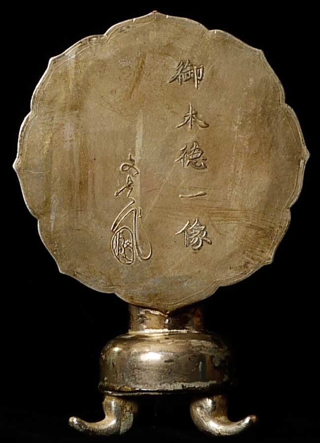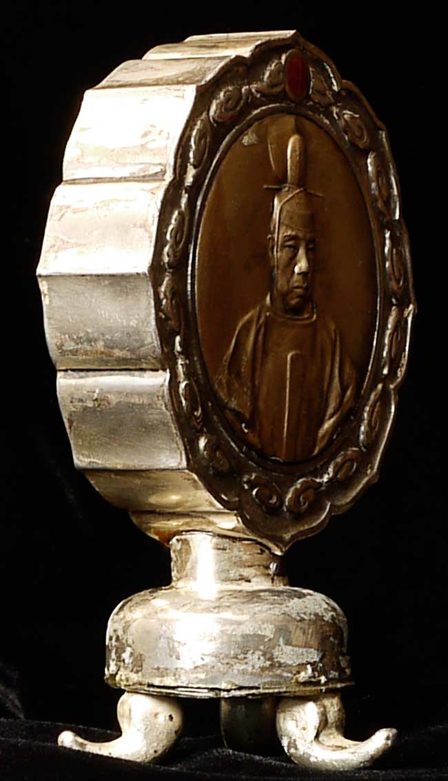 Striking antique Japanese mixed metal Shinto Shrine. 5 1/8" tall, 3,5" at widest point. Obtained by an Amercan serviceman from a Japanese officer during world war II.