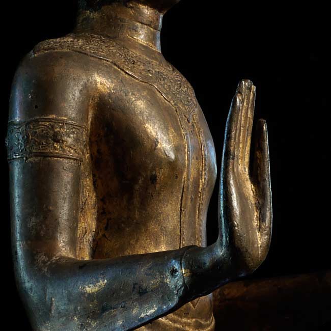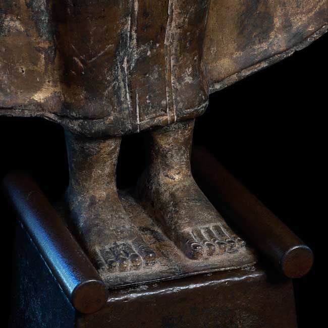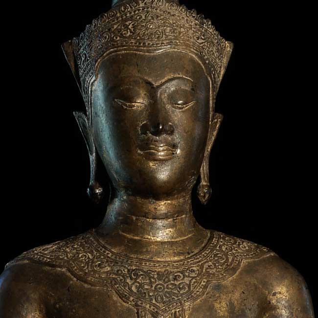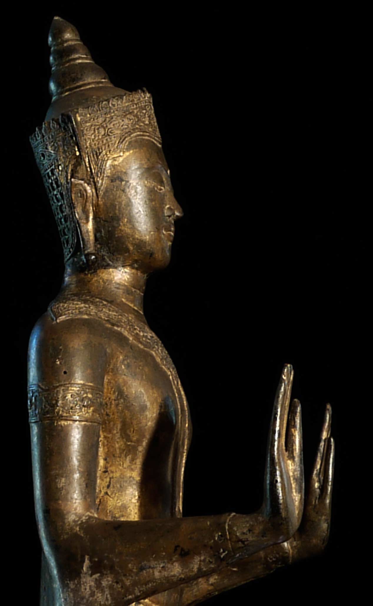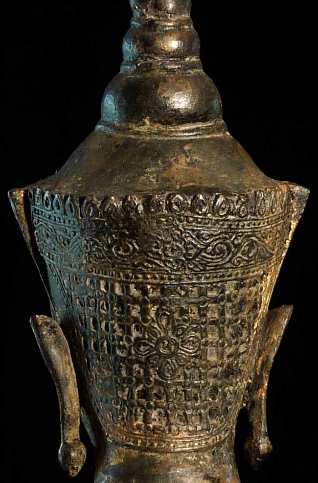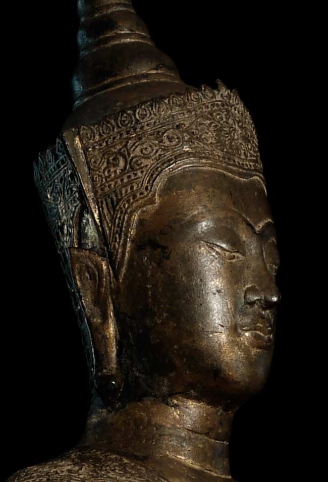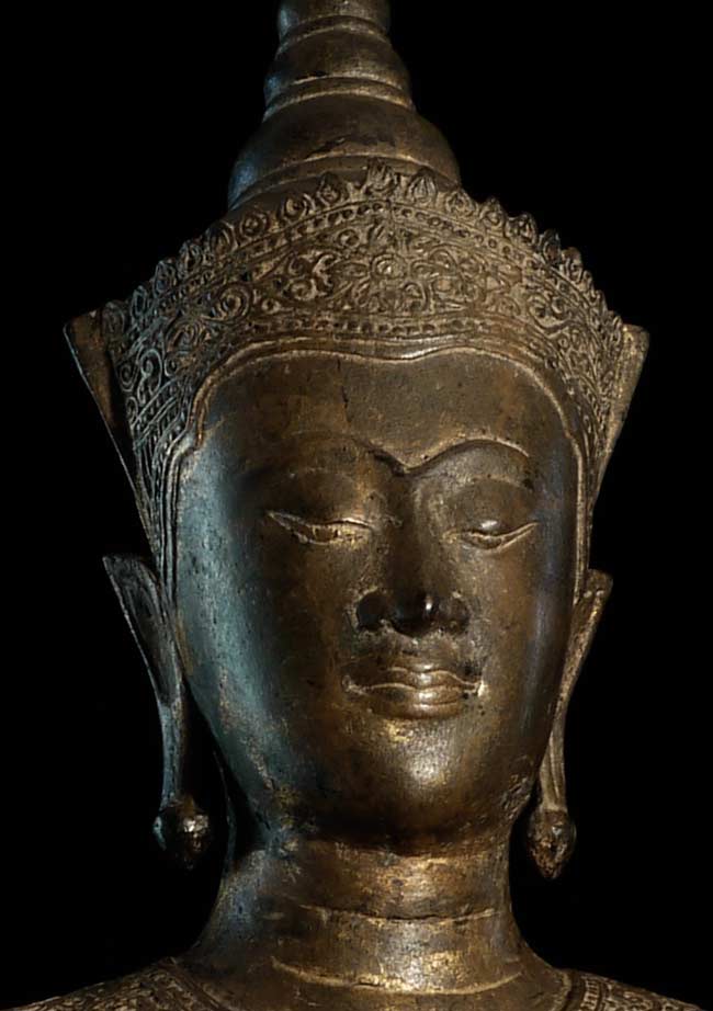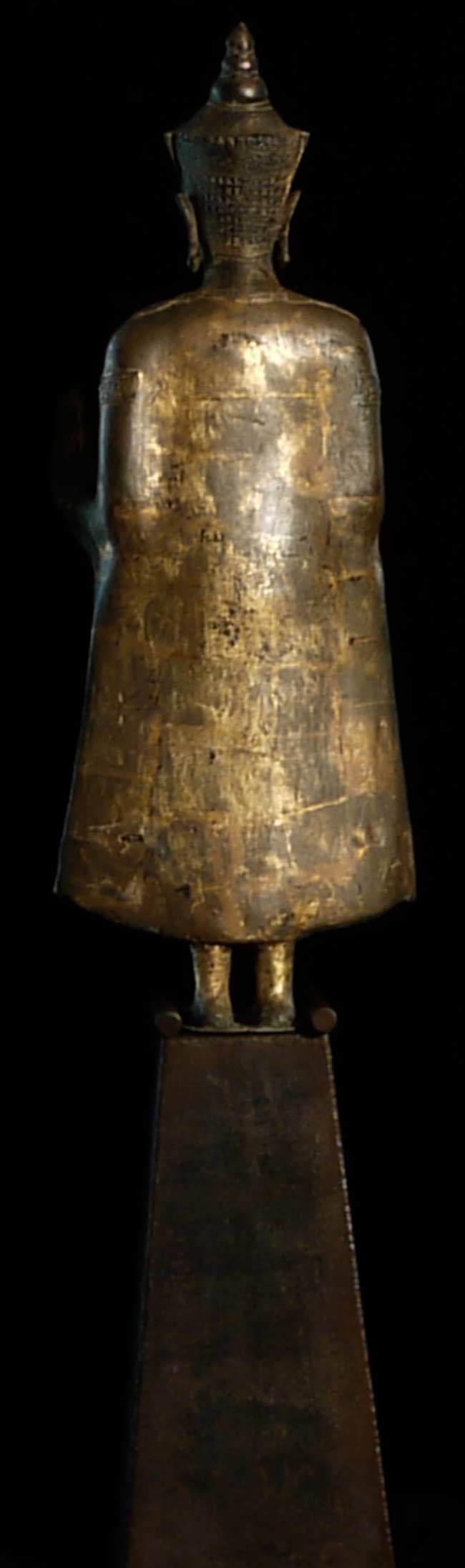 Very good 18/19thC large standing Thai Buddha in a late Ayuthaya style. Commanding presence- currently greets all who enter my home by the front door. 32.75" tall, on a base that is 18" tall (total height is 50.75"). The custom base is 9" square on the bottom and has a rounded lip that the piece slides into (see picture).