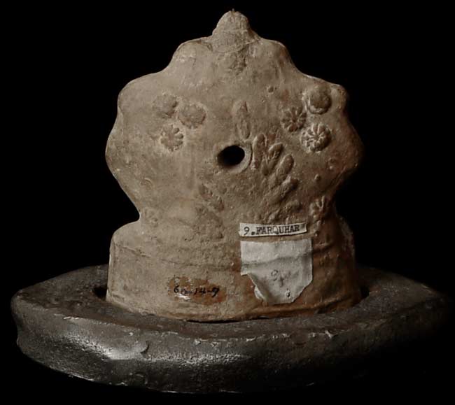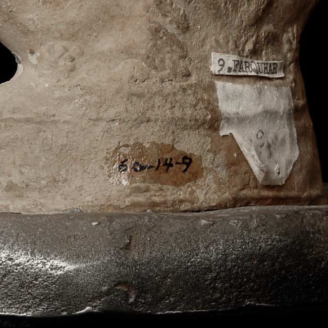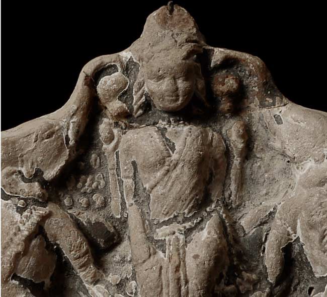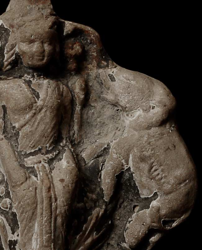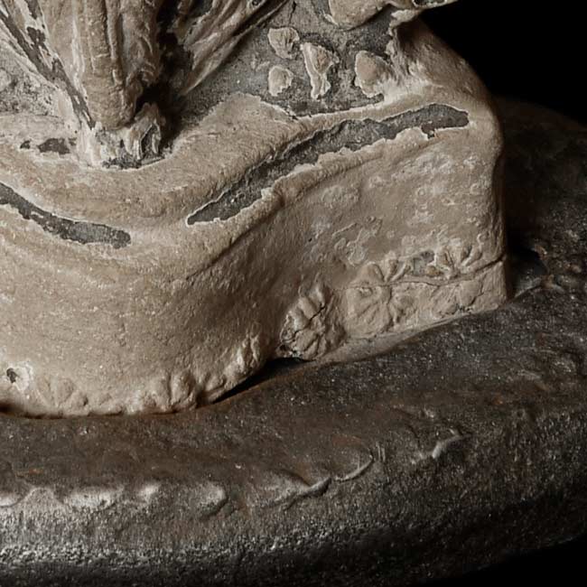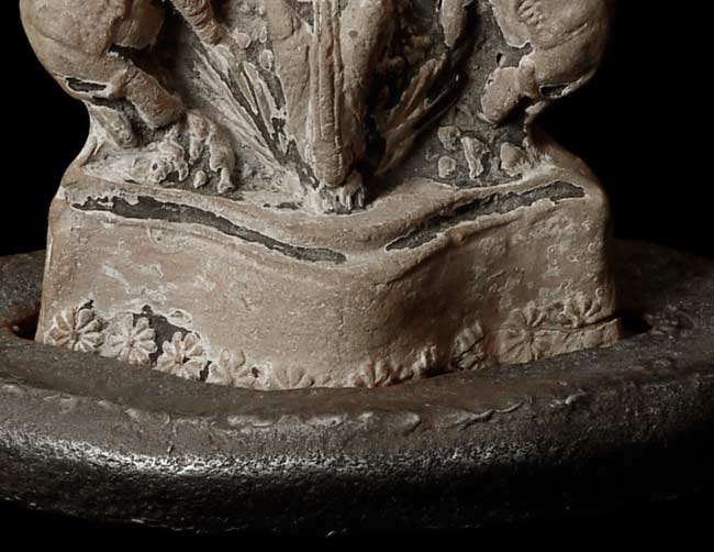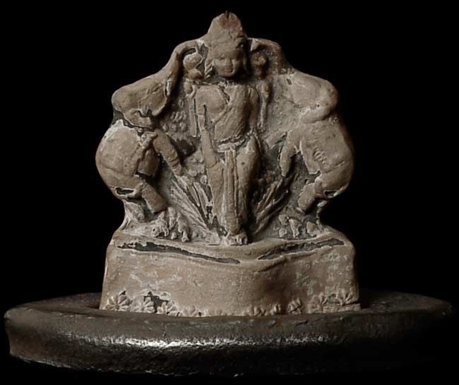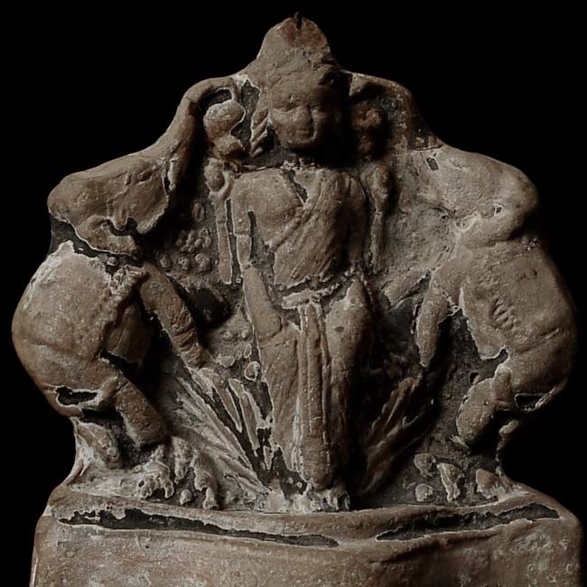A very early deity flanked by 2 elephants. Classic Uma. This piece was de-accessioned by the Asian Art Museum in San Francisco. Has multiple museum numbers indicating they it came in to the museum collection in 1960 with a group of early artifacts. Probably from a small kingdom in what is now Pakistan or Afghanastan, and likely from ths Shunga period, which makes it over 2,000 years old. As such an early terracotta piece, it has wear loss and repairs as seen in the photos. Periodically the museum sells off items to raise funds for new purchases.5 7/8" tall, base is 1.5" x 1" x 1"" tall. Base is 7" wide, 4" deep. Attached to a very heavy bronze/lead base. Never seen another like it- even in books. Extremely rare!!