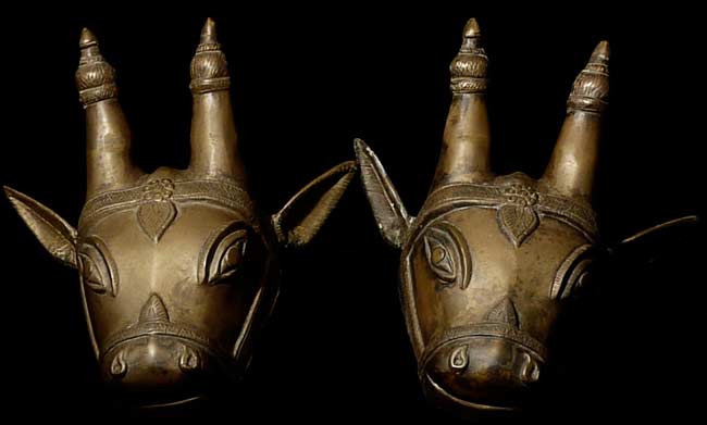 Lovely large vintage pair of Nandi bronze heads- possibly from a Shiva altar. From nose to tip of horns, these cows are approximately 10.5" long, ear to ear 10.25" wide, and 5.25 tall.