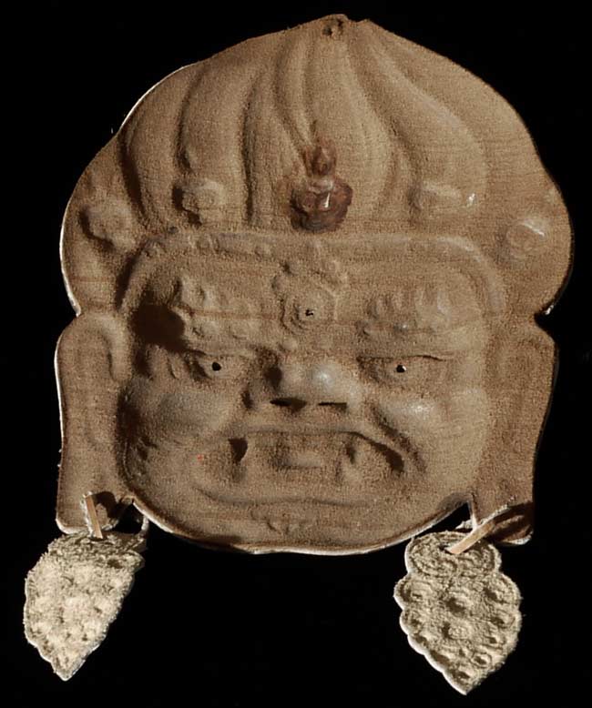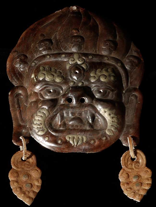 Vintage/old Tibetan or Mongolian leather protective deity mask/face. 7" tall, not including earrings. 5.5" at widest point.