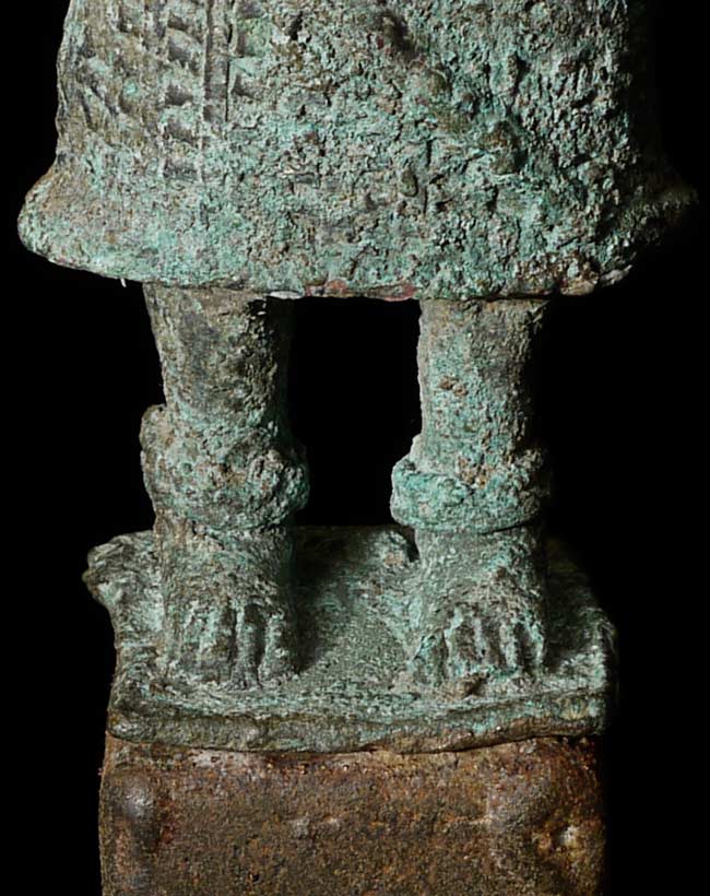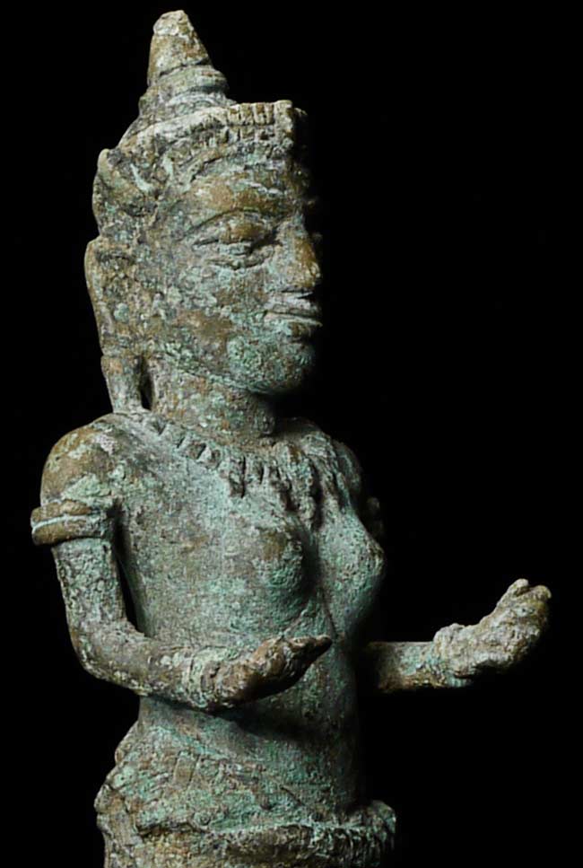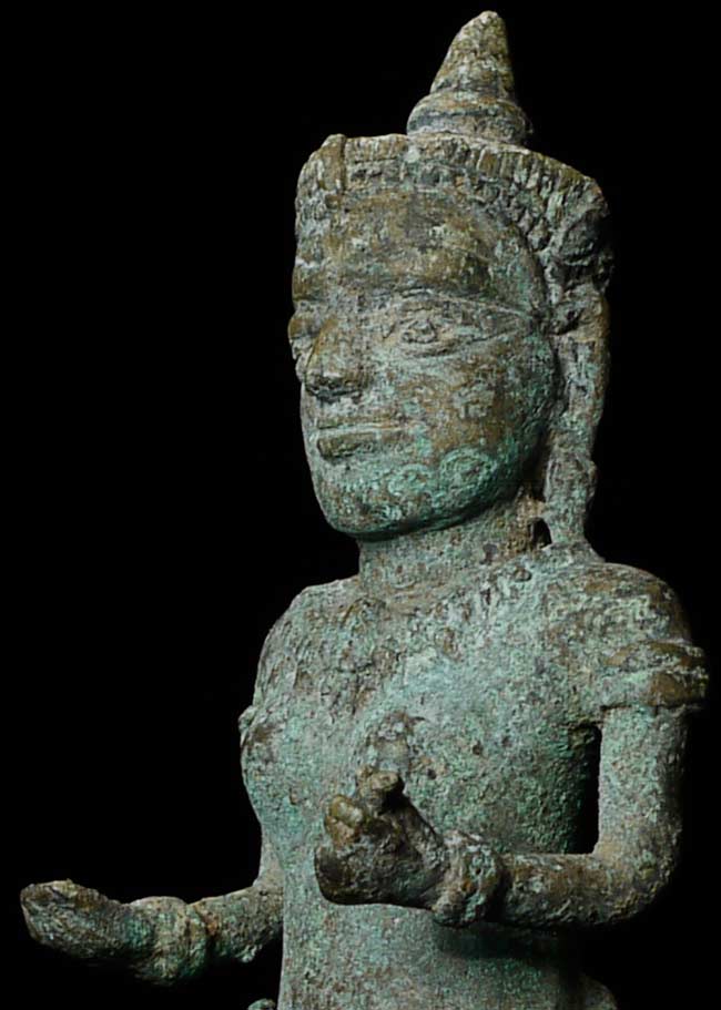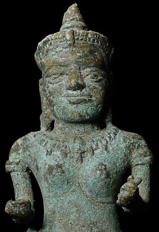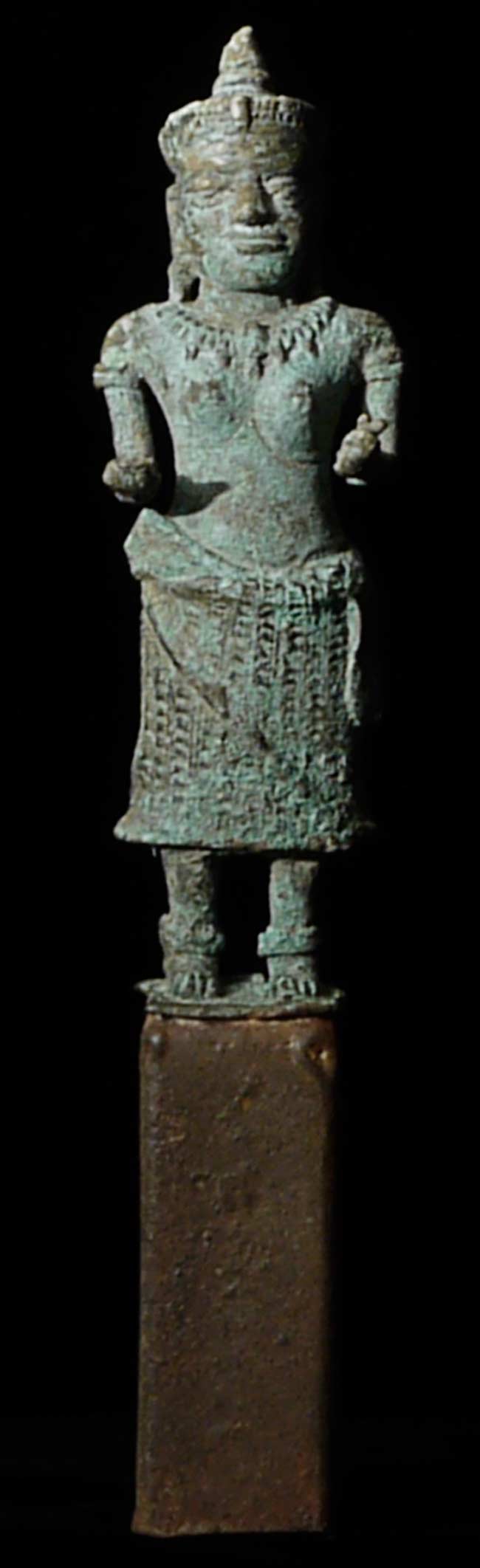 5" bronze Cambodian Uma stands on a custom base for a total height of 8". Bottom of base measures 1" x 1". De-accession from the Asian Art Museum in San Francisco when they moved to the new location many years ago. They had a large group of small Khmer pieces such as this from the original Avery Brundage collection that started the museum in 1960. This is one of those original Avery Brundage pieces. I bought it myself at the auction at Bonhams in the 1990's when the items from the basement of the old museum were sold.