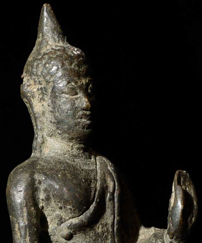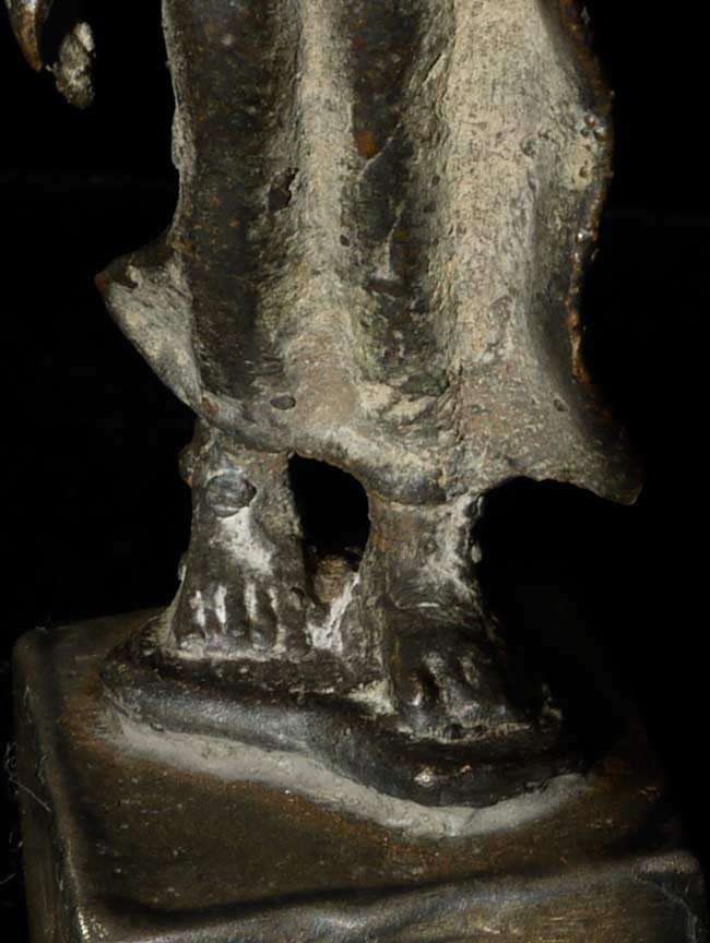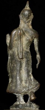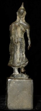 The real deal-a small (near miniature) Sukothai Walking Bronze Buddha. Height of figure is 2 and 3/8", on the base he stands 4". Possibly period (14th century)- may be a later emulation, but looks to be earlier than the bulk of this style, which were made in the late 19thC.