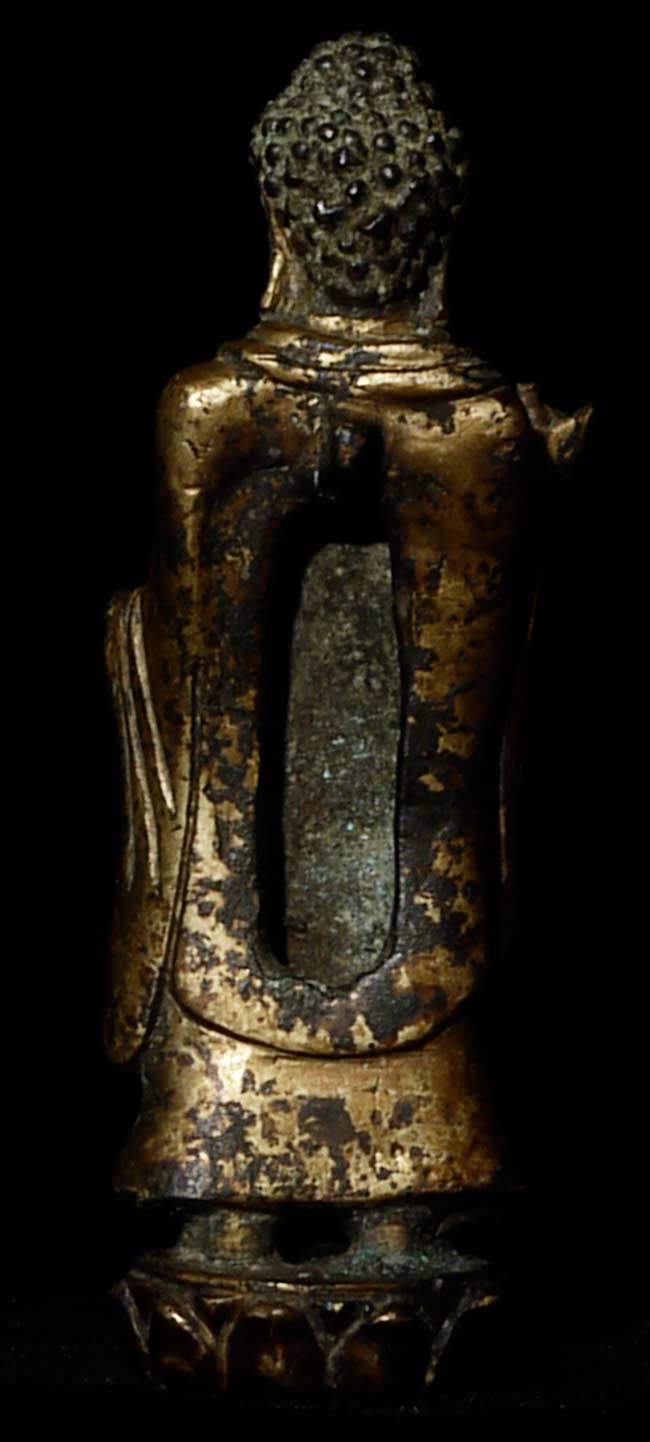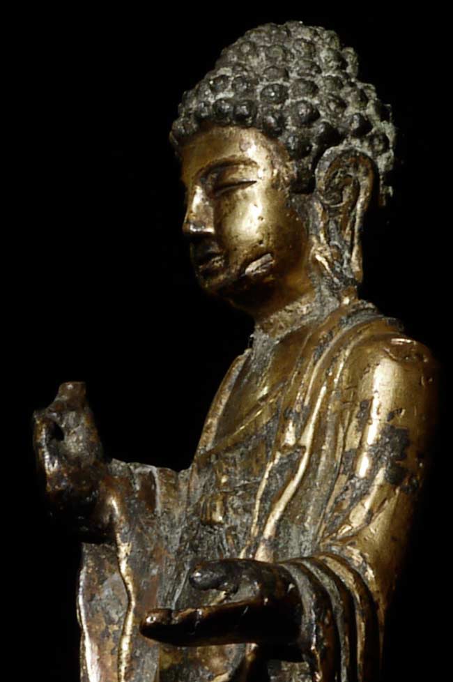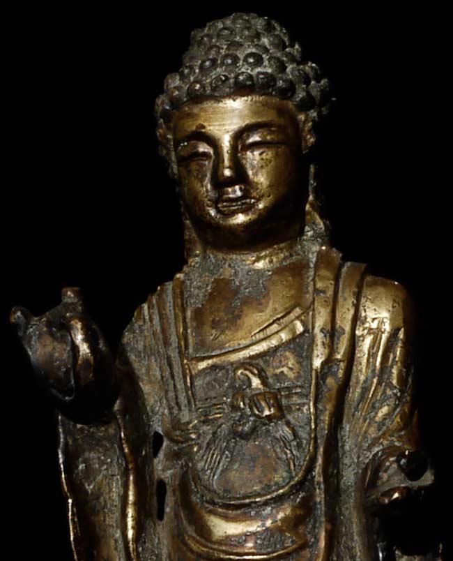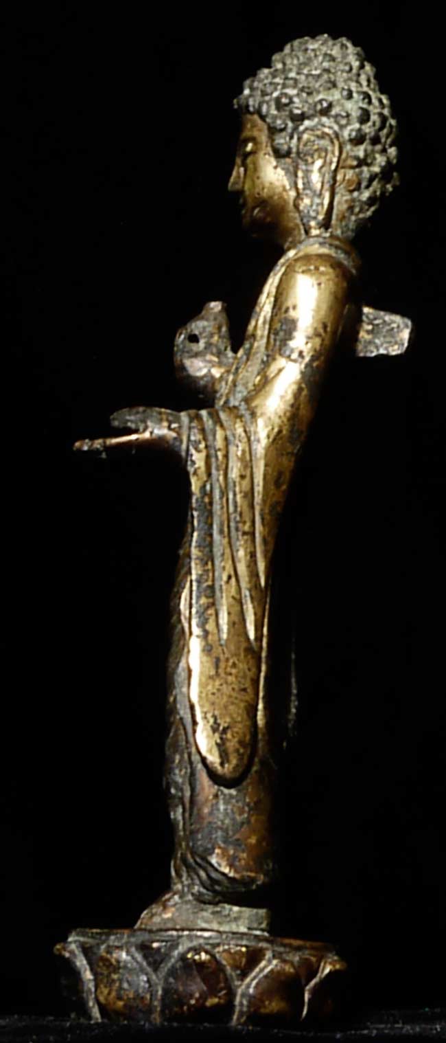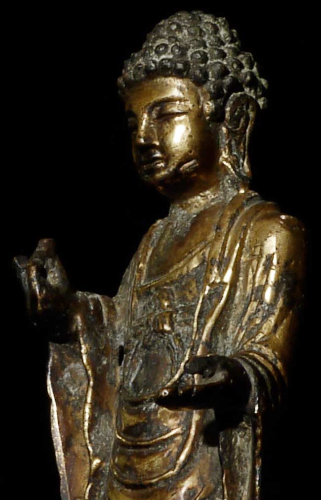Fine 10th century Korean Buddha, with much of its original gilding. Rare to find a quality gilded Korean Buddha this early and in this condition. Loss to some fingers and lower part of base. Leans slightly- could use a custom base. 5 1/8" tall.