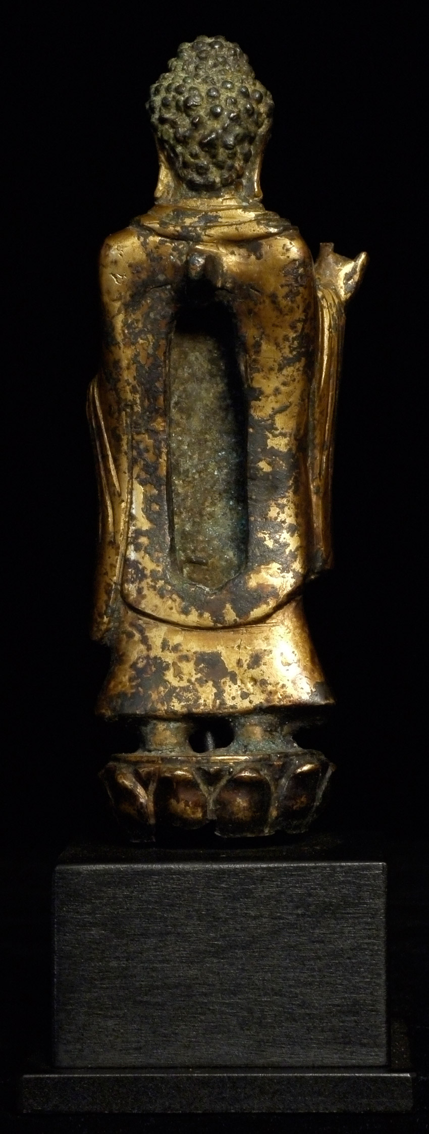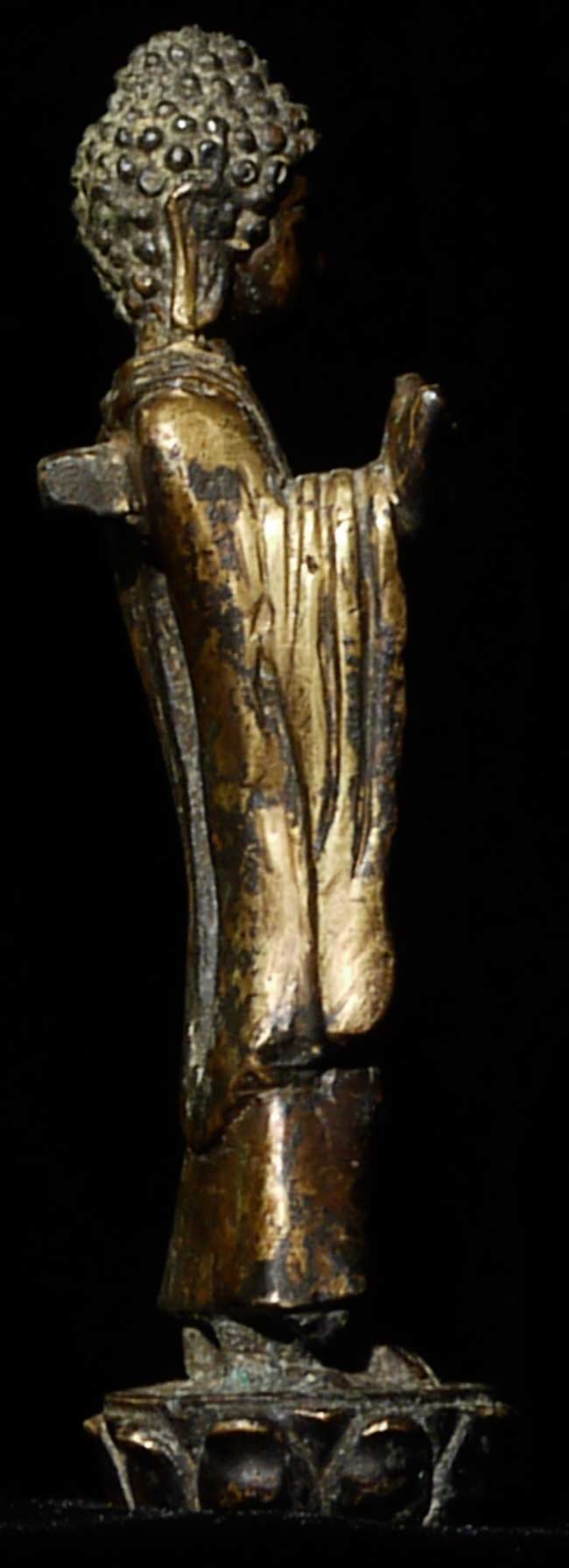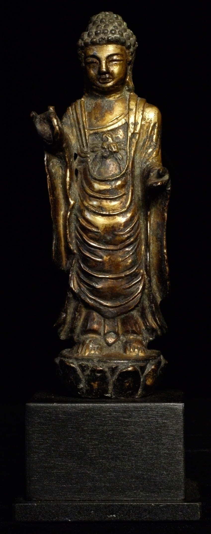 Fine 10th century Korean Buddha, with much of its original gilding. Rare to find a quality gilded Korean Buddha this early and in this condition. Loss to some fingers and lower part of base. Leans slightly- could use a custom base. 5 1/8" tall.