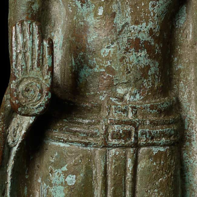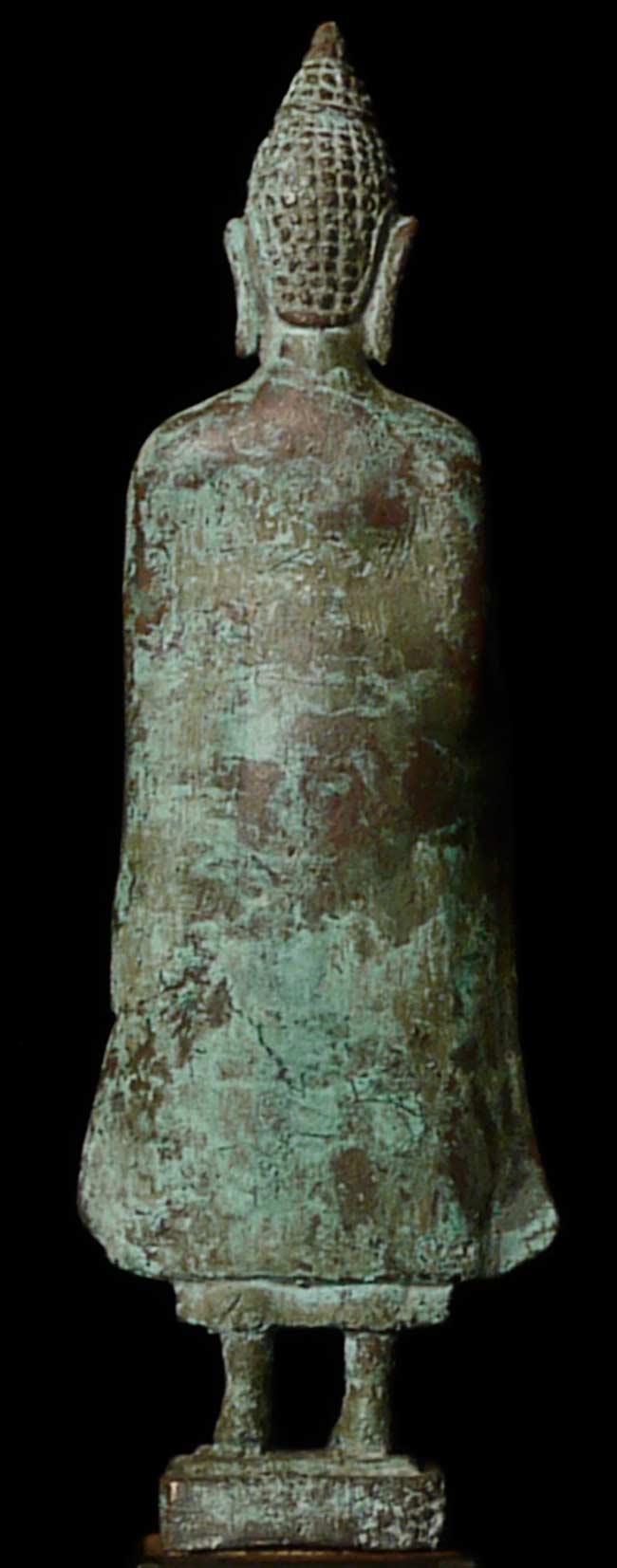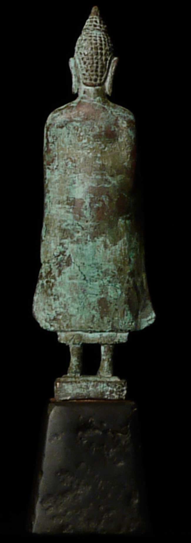 10/11thC Cambodian or Thai Solid Cast Buddha. Rare type, well cast. Bronze is 9 inches. 12" total height, base is 3" tall x 2 7/8" x 2.75"