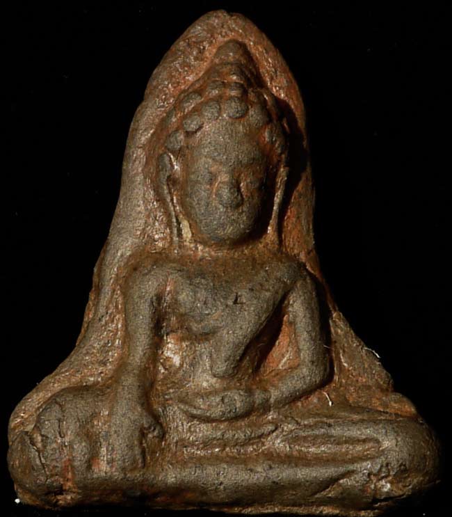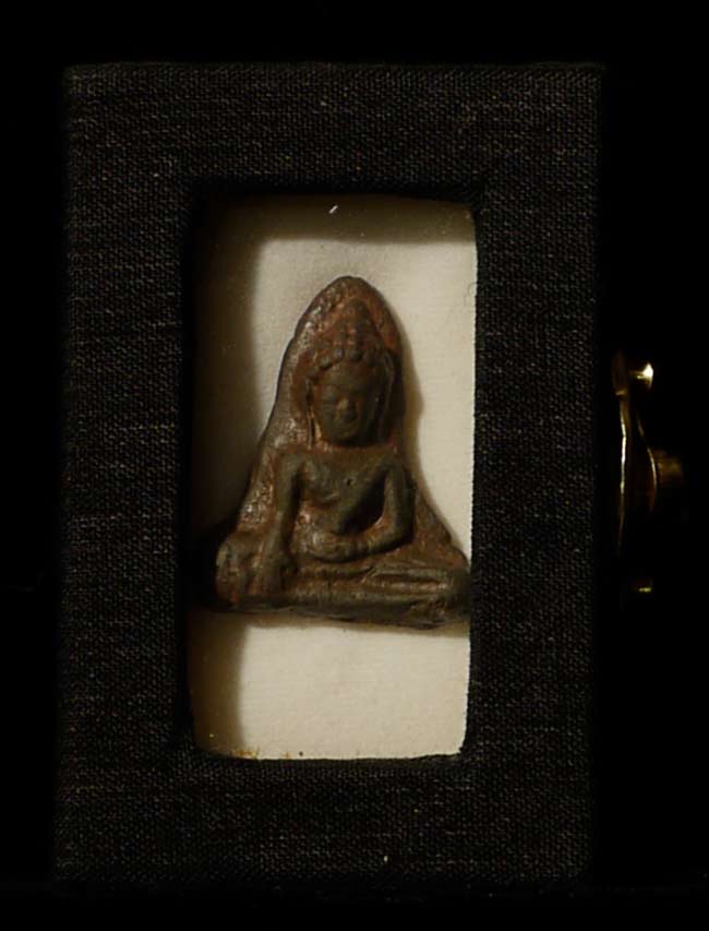 Extremely early Dvarati Buddha amulet. Great presence. Would look fantastic set in gold. 1.25" tall, enclosed in a fabric covered box that measures 3" x 2" x 1.25"