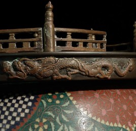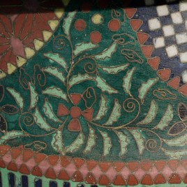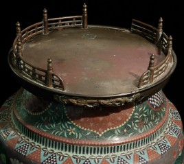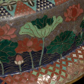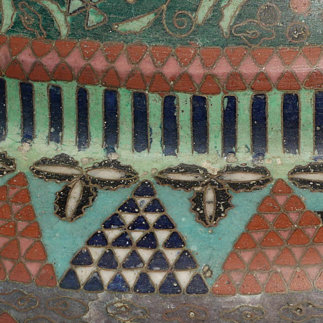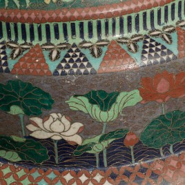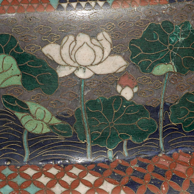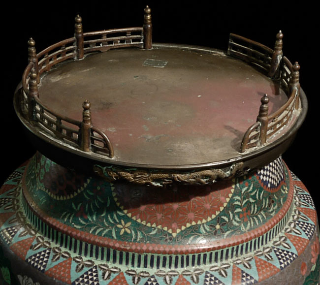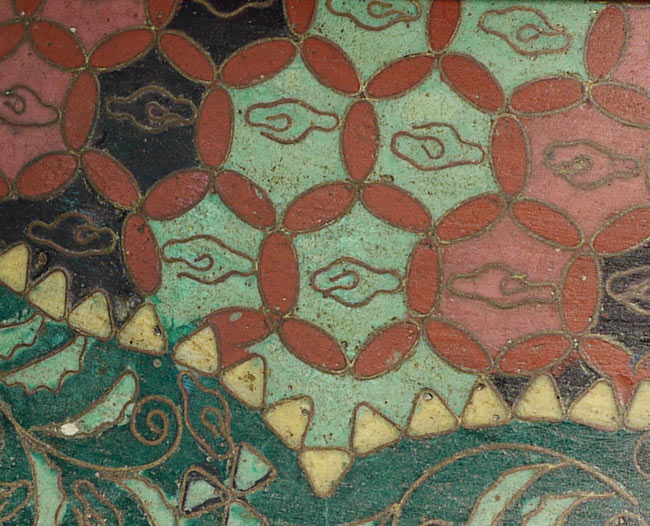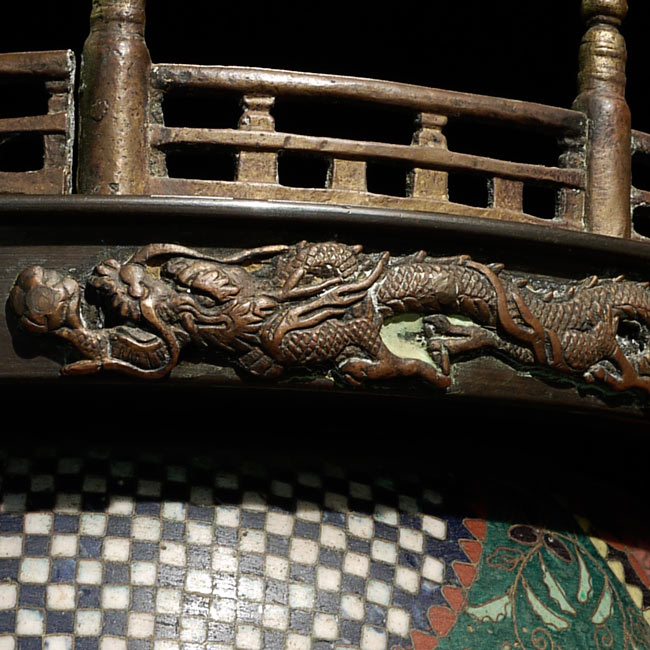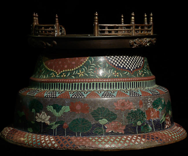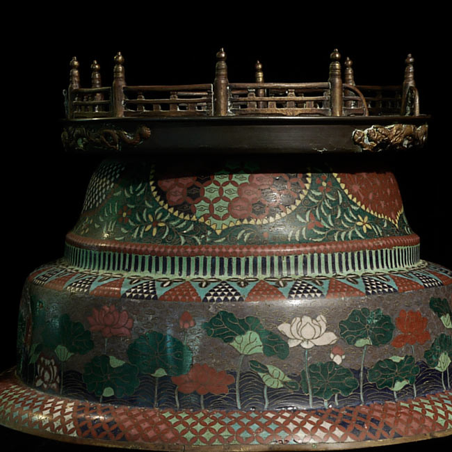 19th C. Chinese Cloisonné on Bronze Home Altar. Absolutely stunning. Some loss and a dent in the back. One piece of rail is missing and 3 are loose. The condition issues indicate ritual use- this was not just a piece for decoration. Not seen another like it. Large at 9" tall, bottom diameter is 13.25"
