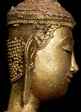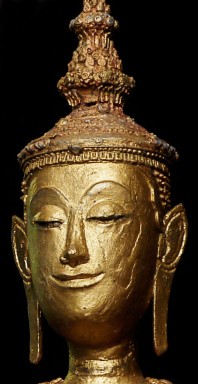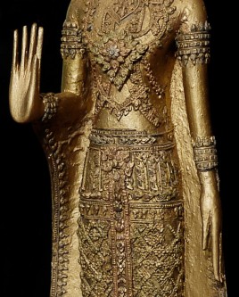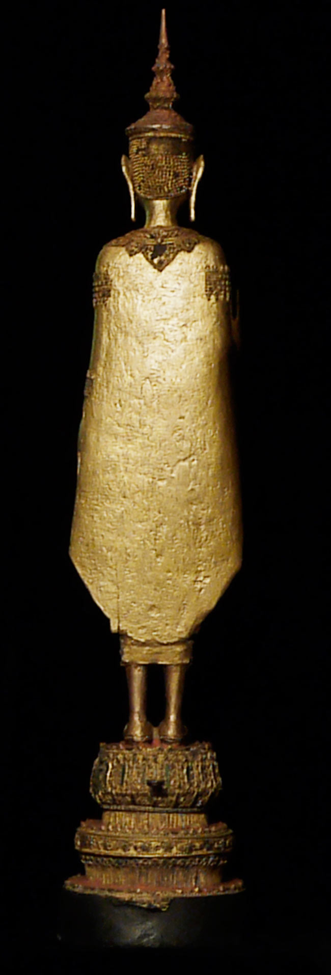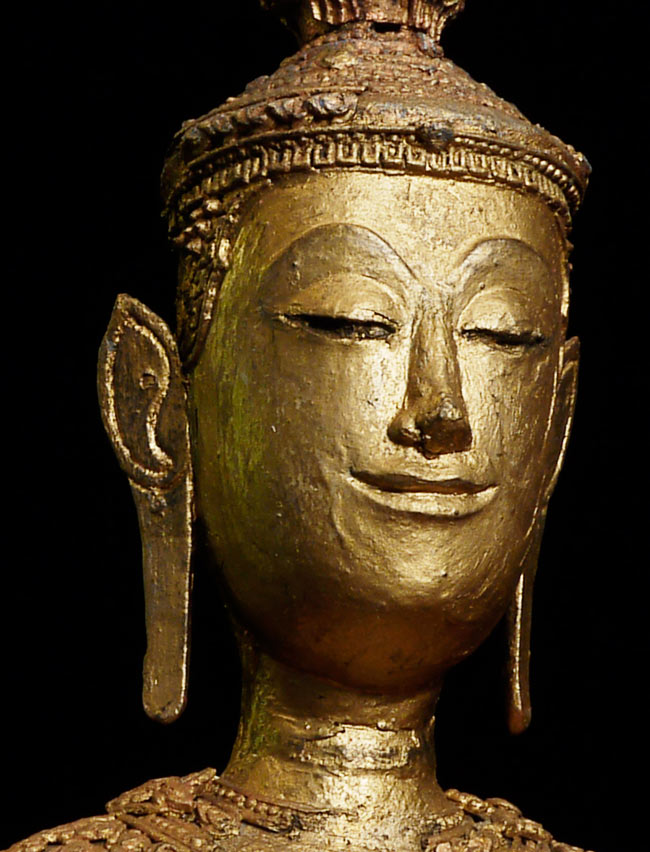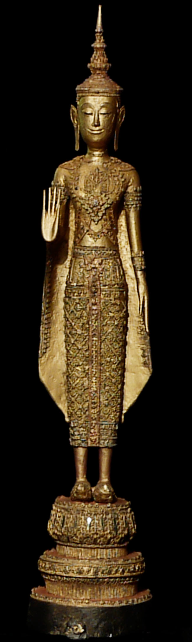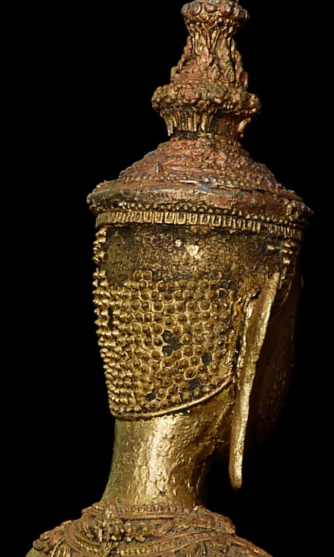 Very fine early 19thC Rattanakosin wooden Buddha with gesso detailing. Quite large at 36.75" tall, base has diameter of approximately 8". Some re-gilding and minor losses, but generally in outstanding condition for such a large detailed wooden Buddha. De-accessioned from a Northern California Museum.