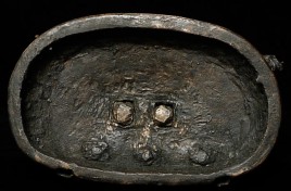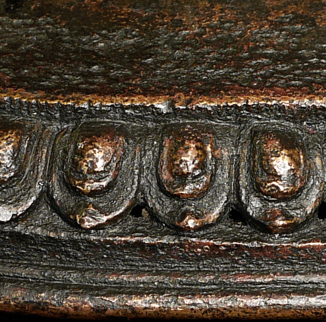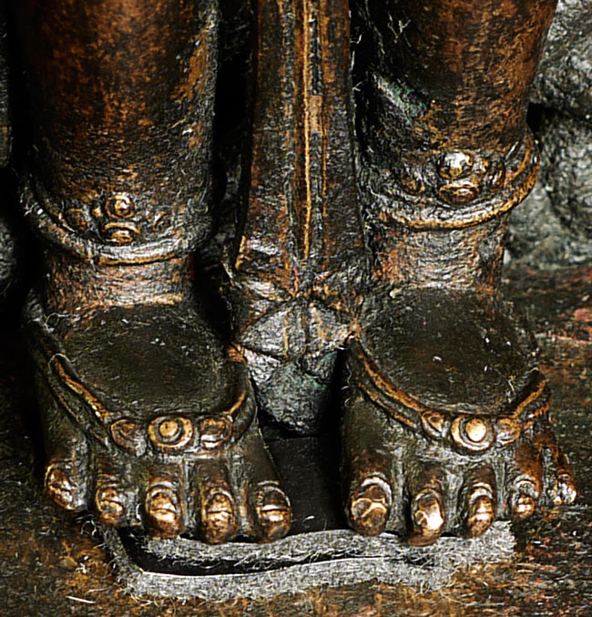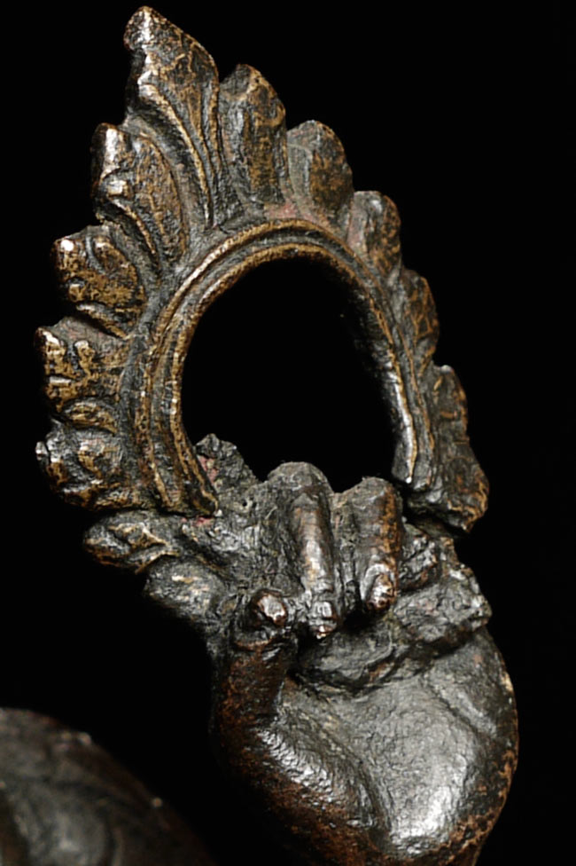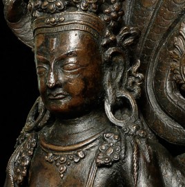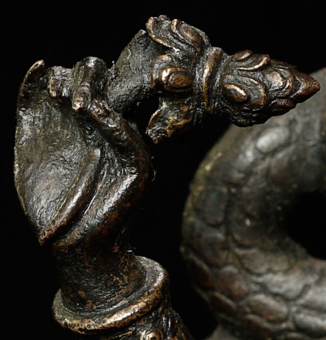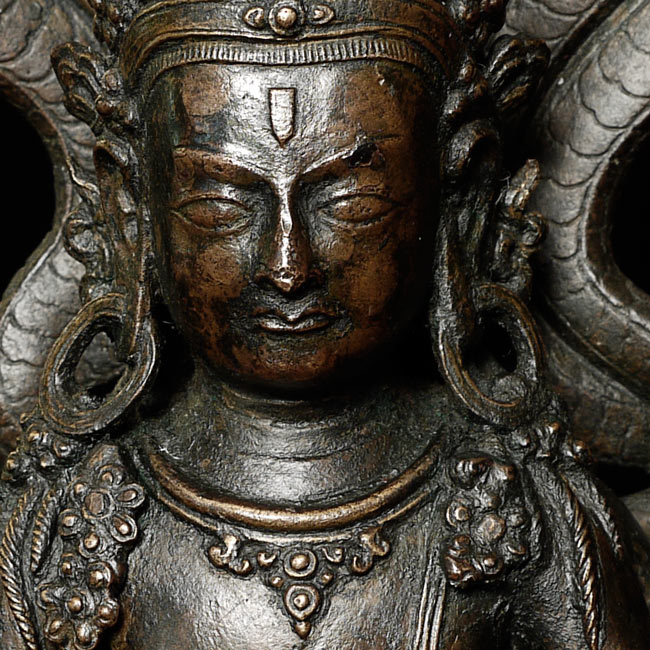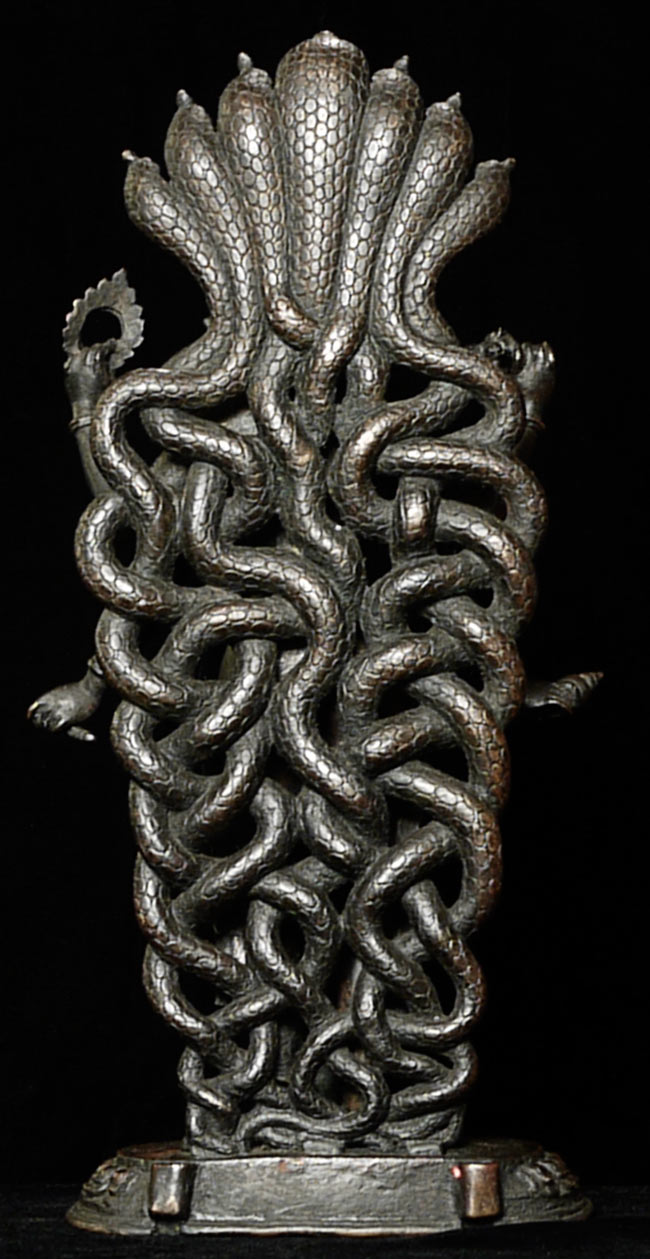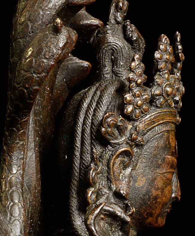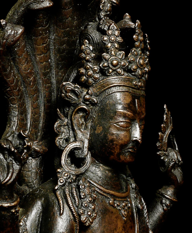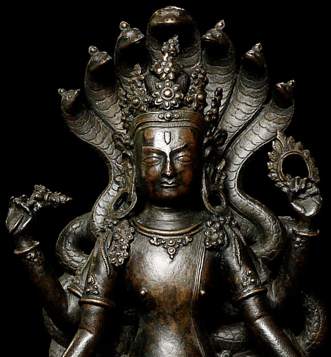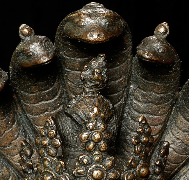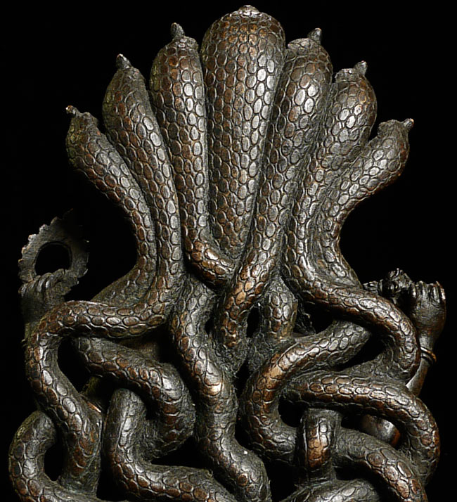 Check out the Nagas- each of the seven has a nice face. The chocolate brown patina complements the overall impression. The back of the sculpture is as beautiful as the front. I have never seen such a beautiful Nepalese Naga- ever. The casting and sculpting are a big step up from the vast majority of Nepalese bronzes. Large at 11.5" tall, base is 5.25" x 3". Strong spiritual feeling to the beautiful face.