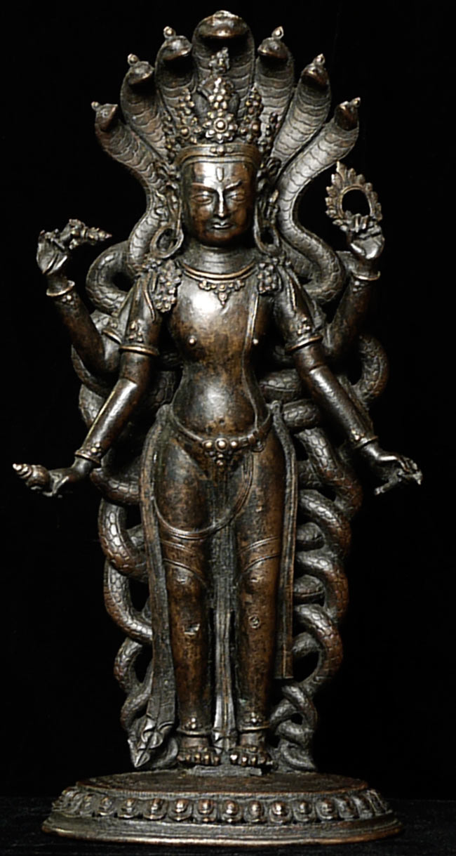 WOW- superb 19th century Nepalese standing Vishnue protected by an amazing 7 headed Naga. From a German collection-was sold by the renowned German Auction House Nagel in 1997. Loss of part of one attribute and a finger or two on one hand. One attribute is bent. Also, he needs a small shim under his feet so that he does not lean forward.