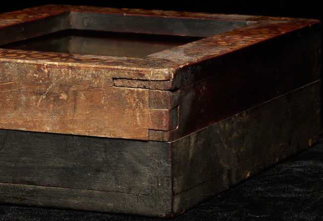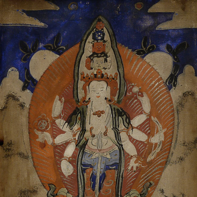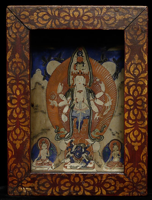 A wonderful old Mongolian Thangka housed in an ornate gau box, featuring a rich stenciled floral design. This devotional piece measures 9.25 inches (23.5 cm) H x 6⅞ inches (17.5 cm) W x 2⅞ inches (7.3 cm) D. Inside, the finely painted deity—likely Avalokiteshvara with multiple arms—is surrounded by attendant figures and vibrant halos, all rendered in traditional mineral pigments. The aged surface, gentle wear, and deep coloration lend authenticity and spiritual presence. A rare survival of portable Mongolian Buddhist art, this Thangka-in-gau is an exceptional addition for collectors seeking character, craftsmanship, and cultural depth.