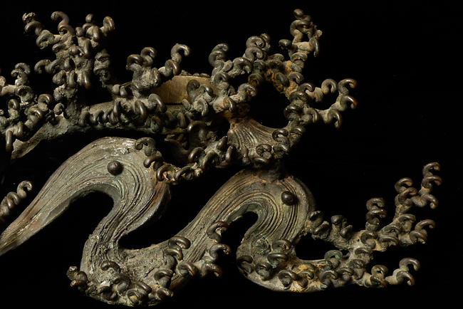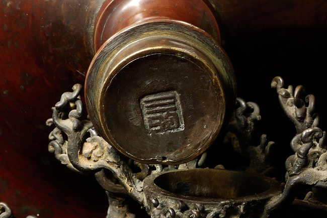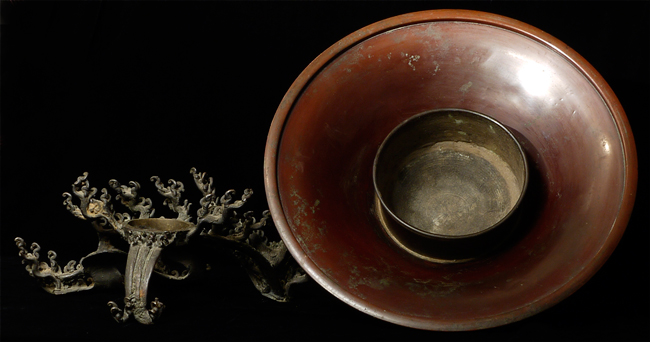 Japanese Two-Section Bronze Usubata/Waves, Meiji. Two-section patinated bronze ikebana (flower arrangement) container, the upper section of flaring conical shape with a thick everted rim and centered by a cylindrical water receptacle in the interior well, all raised on a reticulated support fashioned as cresting waves, the underside of the vessel with a cartouche reading 'Izumikawa' (some corrosion), 9.75''h. Lovely!
