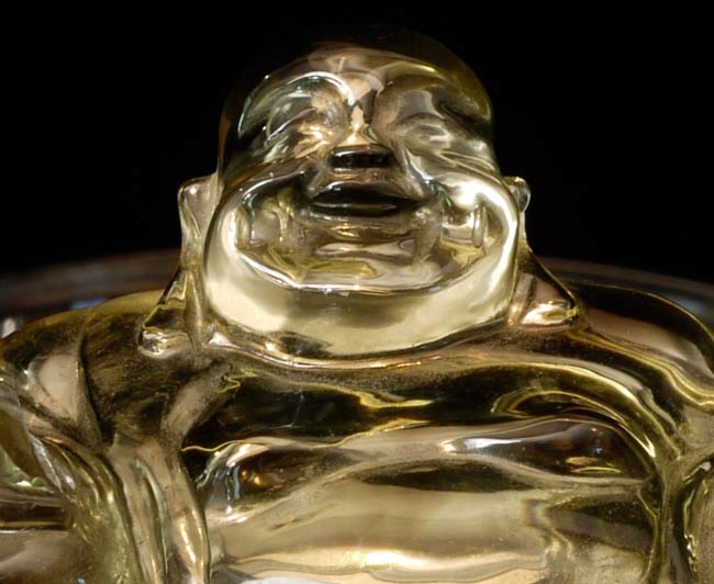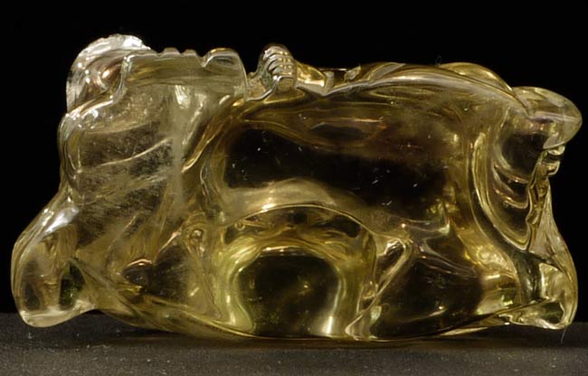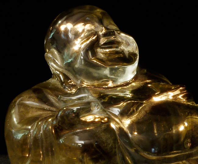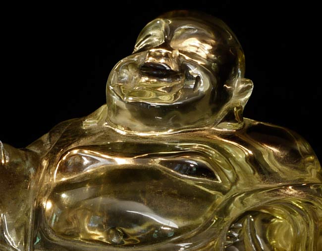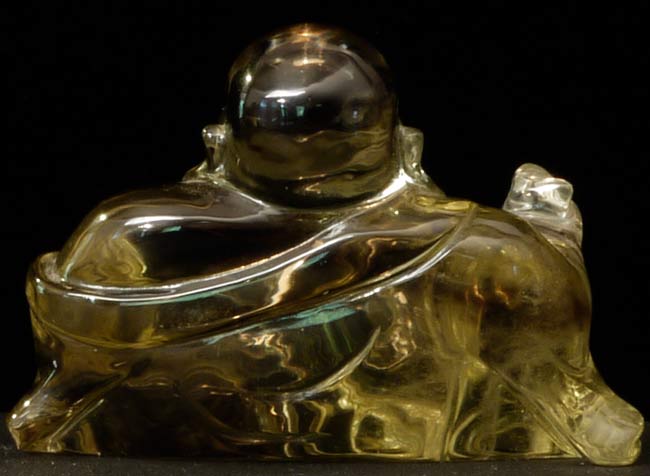 Joyful vintage/old Hotai carved in citrine. Perfect, save the object which was in his hand, which has chipped off. Measures 1.25" tall, 1 5/8" wide and 1" deep.