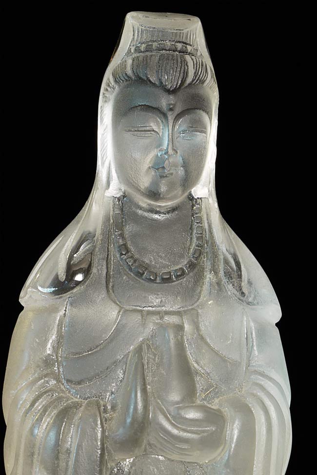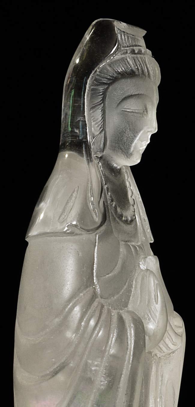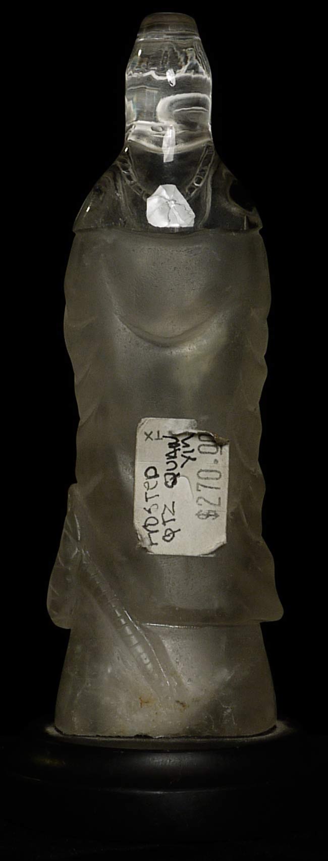 Frosted quartz Quanyin is 5.5" tall, 2.25" diameter base. Has an old price tag of 270 dollars. My price is half of that.
