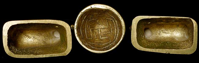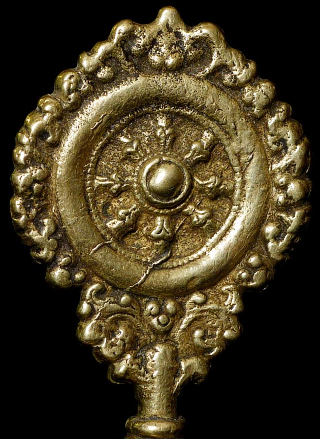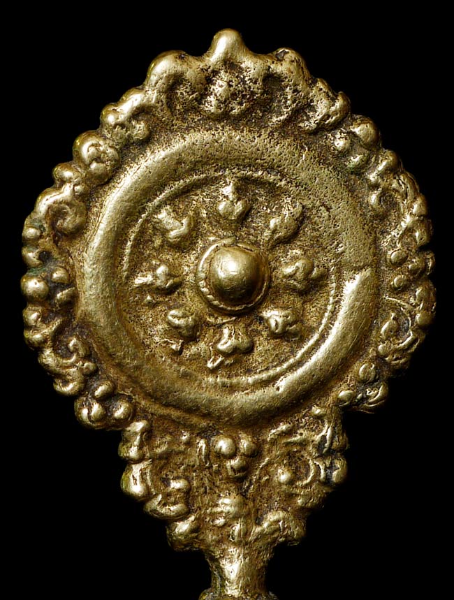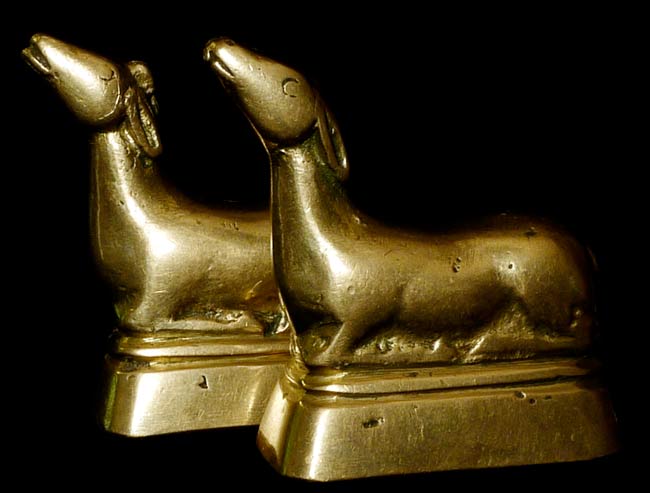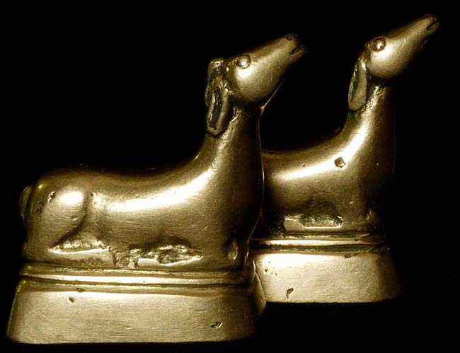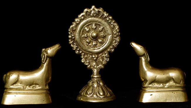 Antique set sybolizing the Buddha's surmon at Deer Park along with the Wheel of the (Buddhist) Law. Wheel is 2 7/8", deer are 1.75". Very sweet!