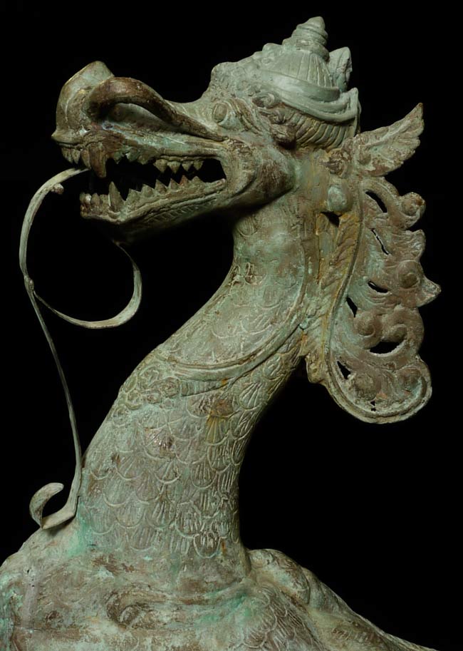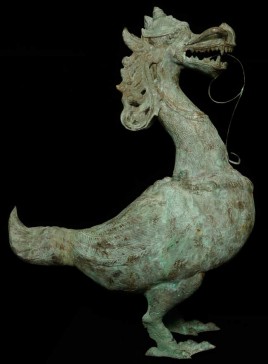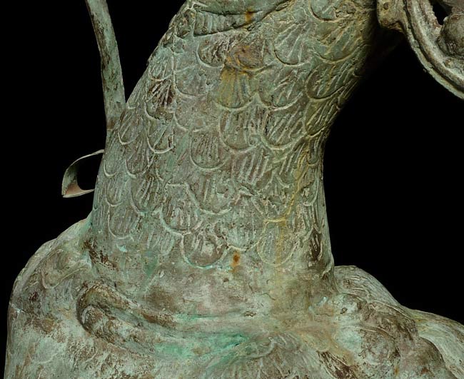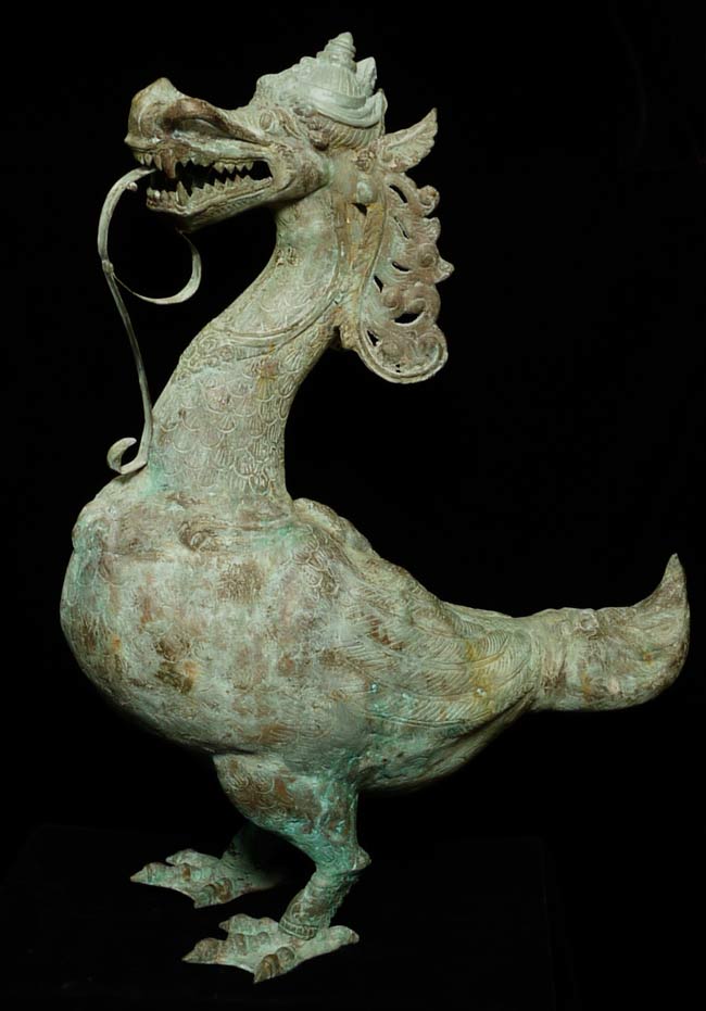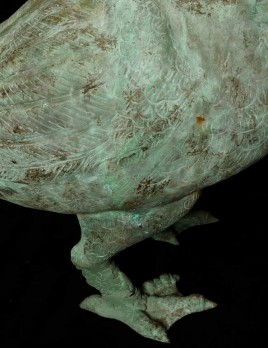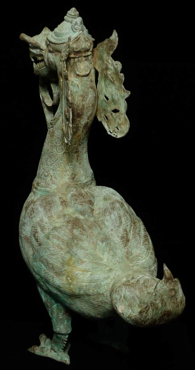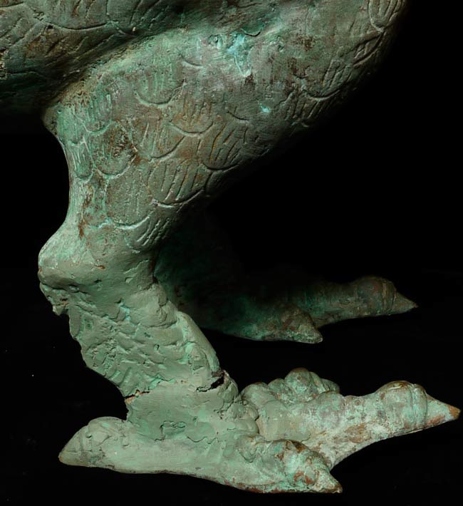 This amazing old creature is part duck, part dragon. He stands 29.5" tall, 21.5 from tail to breast, and is approximately 9" wide.
