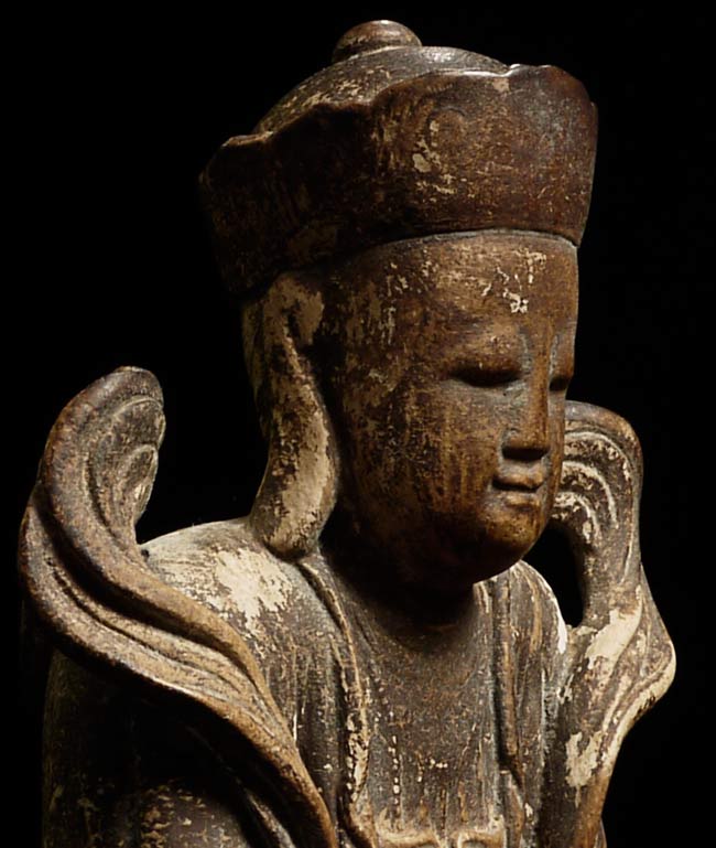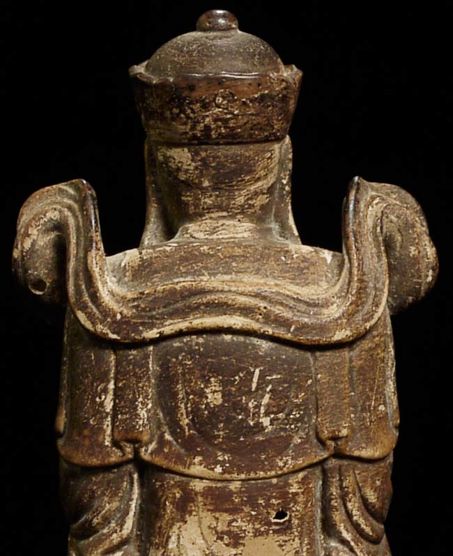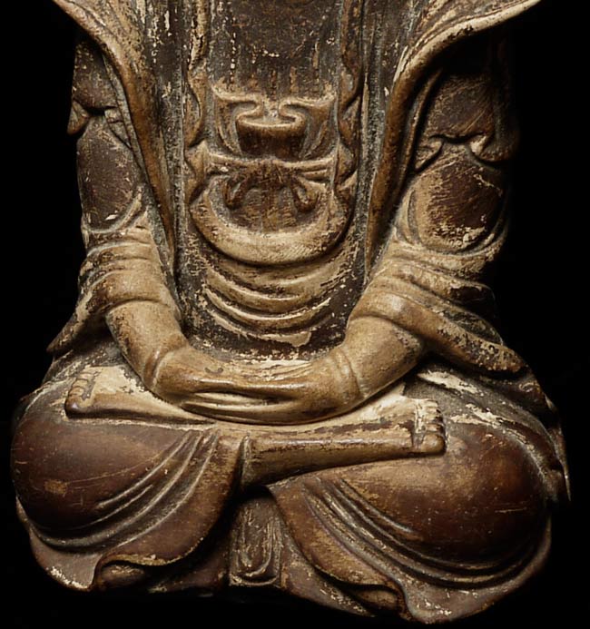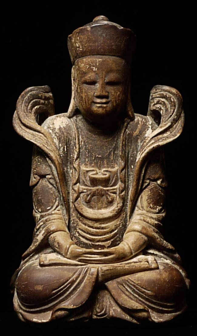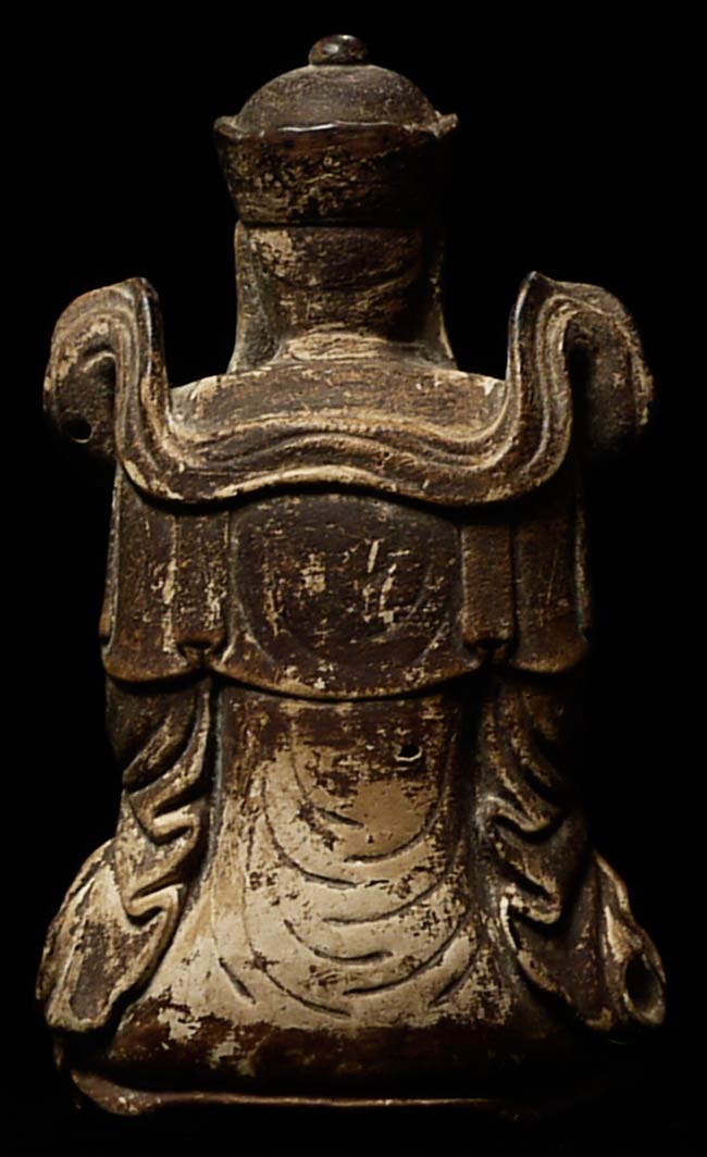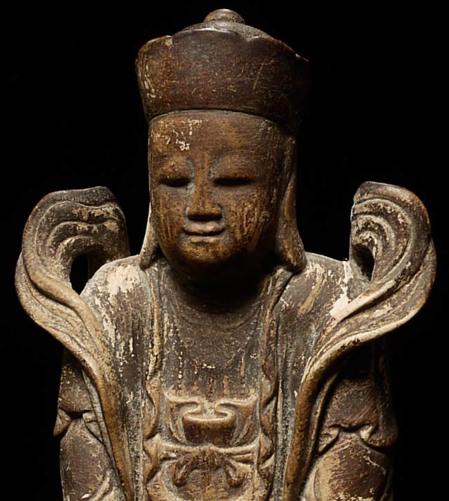Antique ( 17th early 18thC as per early 20thC label on the bottom)Chinese finely sculpted out of a compressed solid brick (I(clay/white substance) Buddha. Superb face. Expectable wear, but (remarkably) no damage or repairs. Special piece. 6.5" tall, base measures 3.5" x 1.75"