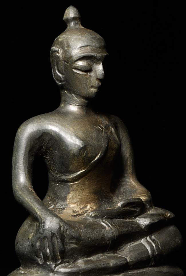 Very special 17-19thCantique Northern Thai Buddha sculpted in a hard black stone. Head re-attached. 2 7/8" tall, base measures 1.75" x 1.25". Lovely and serene.
